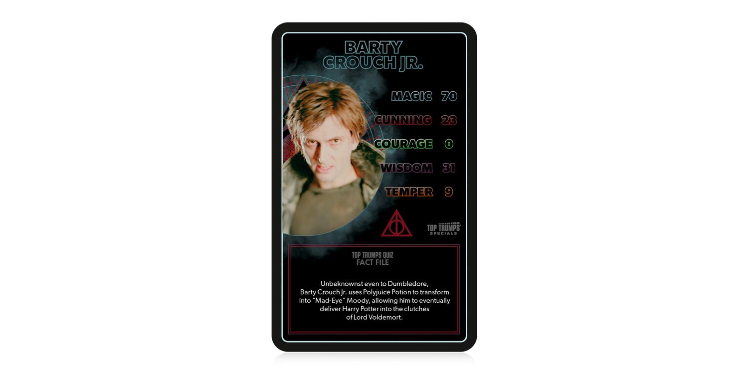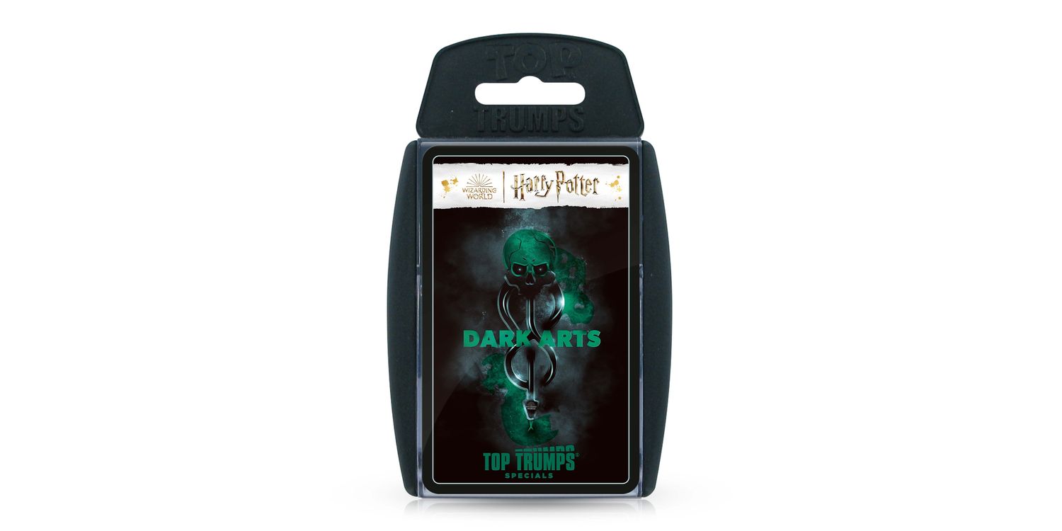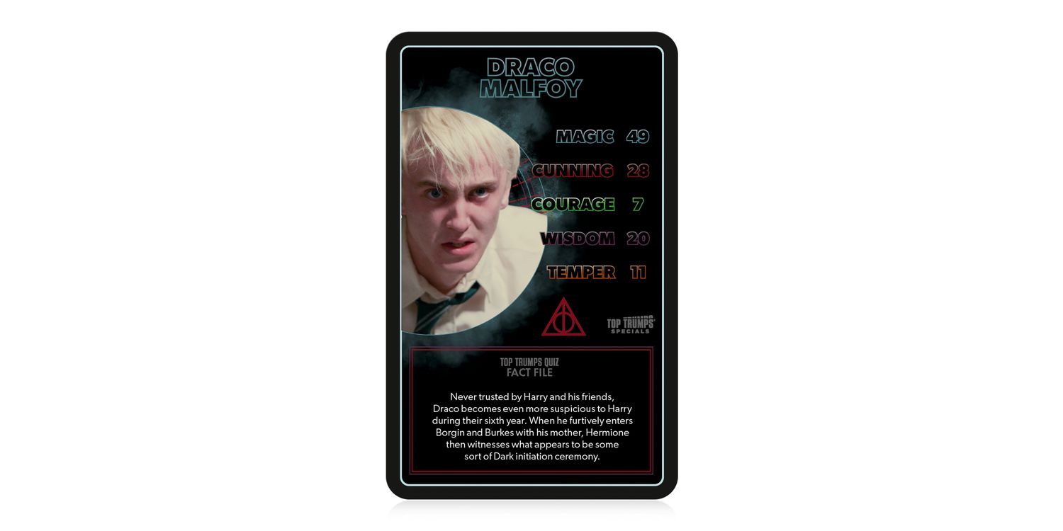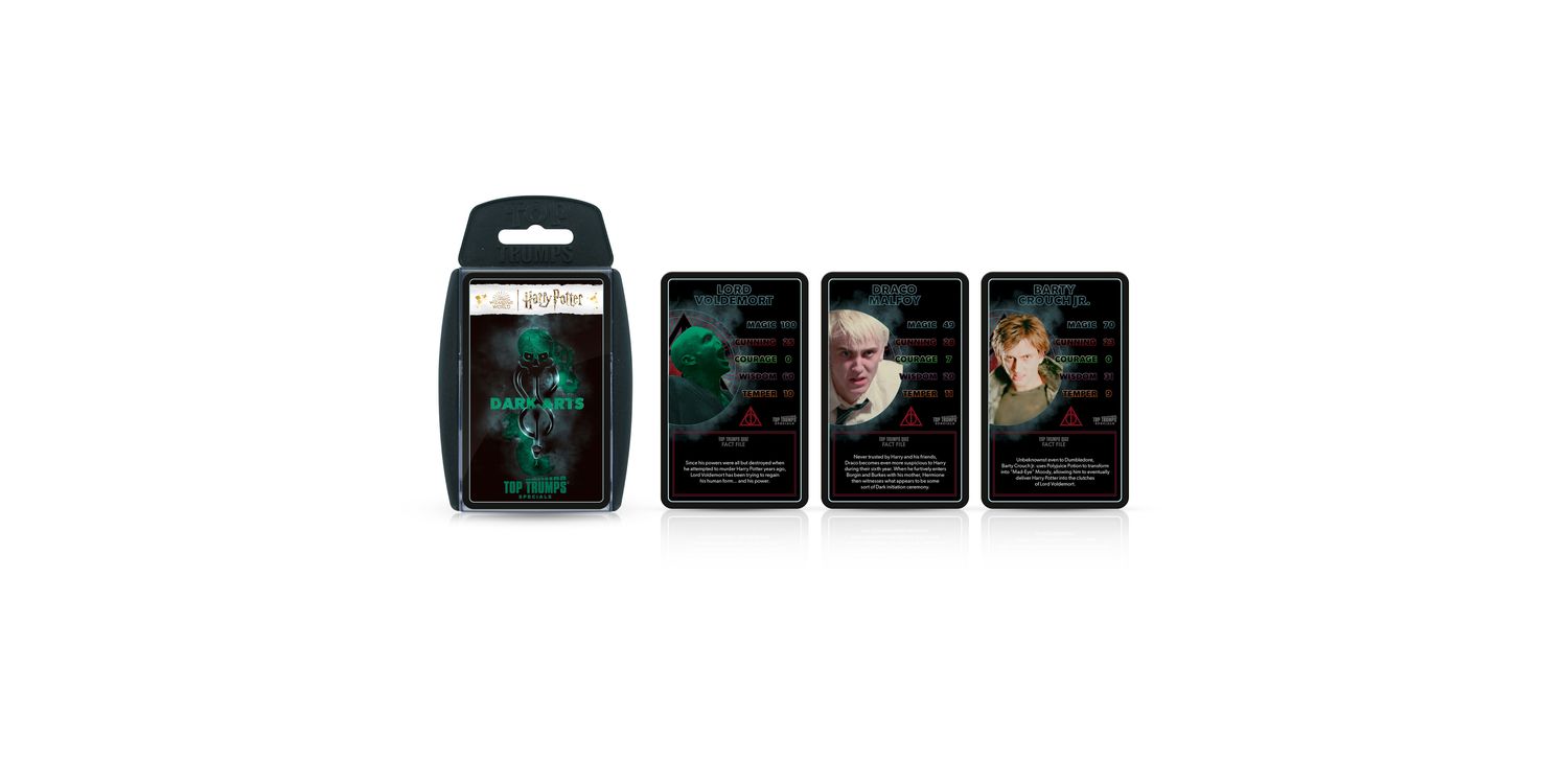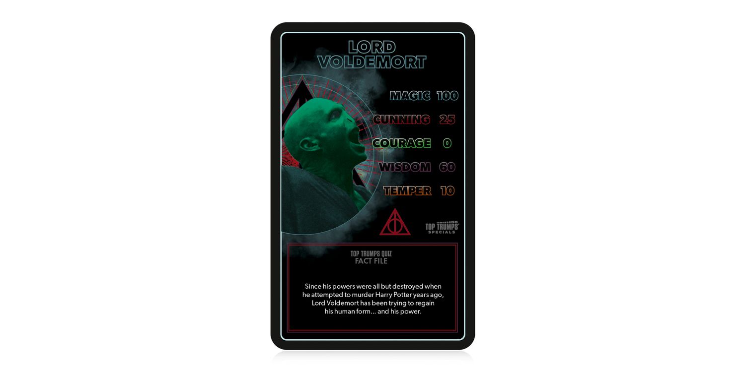 Lord Voldemort is amassing his sinister forces to rise up against the legacy of Hogwarts in this new Dark Arts edition of Top Trumps Specials. With a glow-in-the-dark cover and a selection of terrifying Death Eaters, you can find out what makes the Dark Lord so deadly with thirty cards depicting Voldemort and his most dangerous allies. This truly terrifying pack has it all, from the ferocious Fenrir Greyback, to the wild Bellatrix Lestrange, the unassuming Professor Quirrell and the misguided Draco Malfoy. Will the Dementor’s Magic stat drain the colour from your opponents’ cheeks, or will the Carrow Twins’ Temper scores leave your foes wishing for an Invisibility Cloak to hide under? With categories including Courage, Cunning and Wisdom, each card also features a custom bio that tells you everything you need to know about these villainous witches and wizards. So shuffle the cards and deal in your friends. Lord Voldemort’s takeover begins with you!