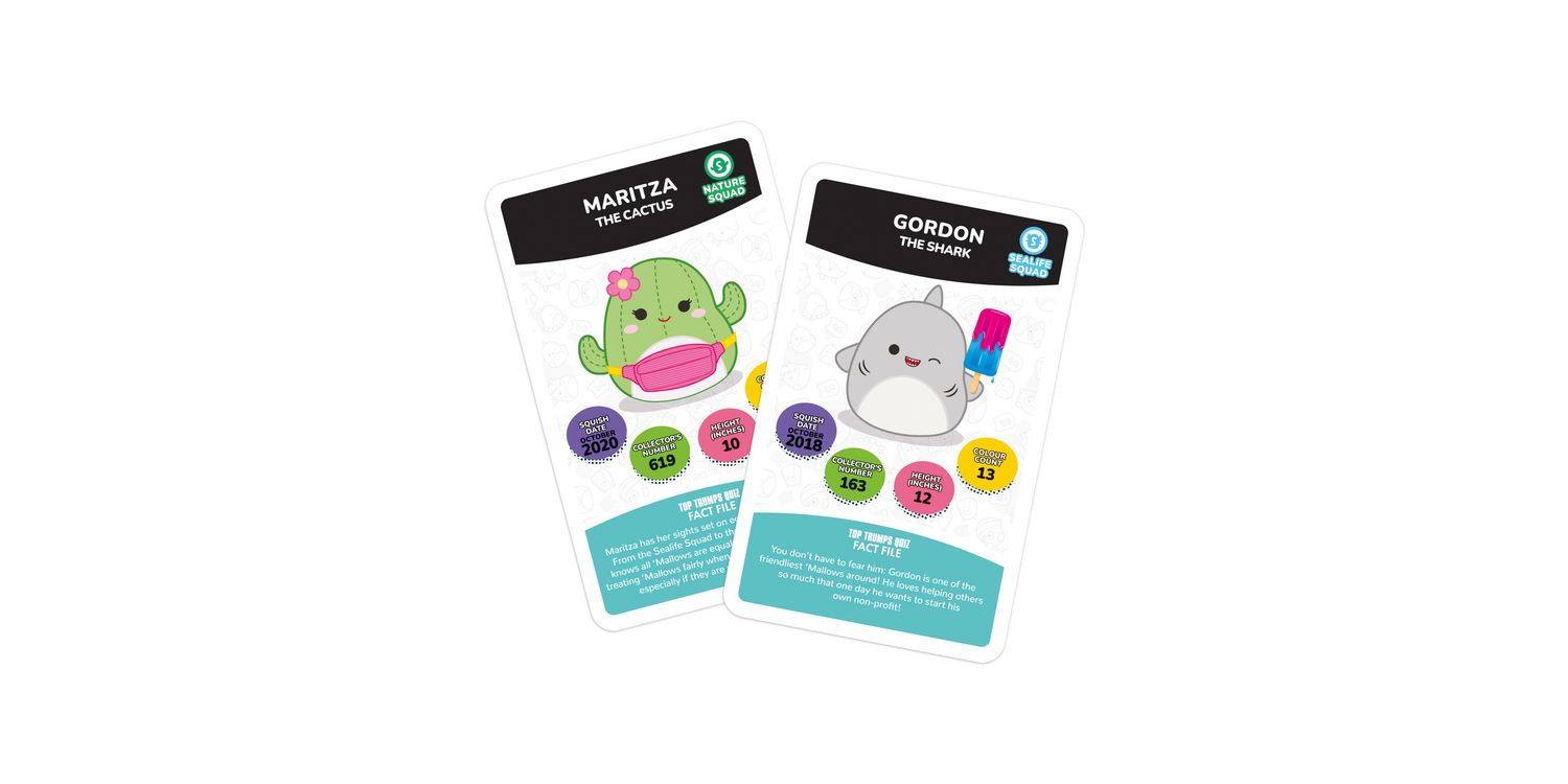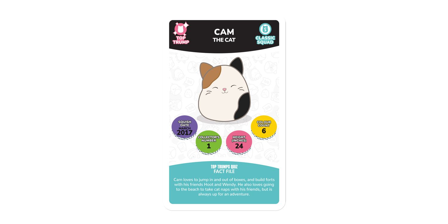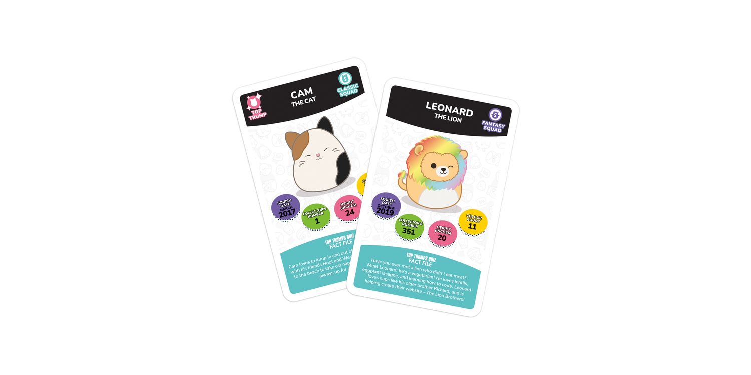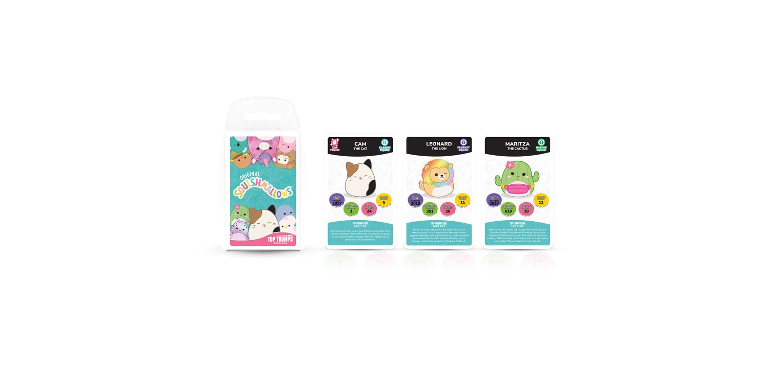 Join Cam the Cat, Winston the Owl, Lola the Unicorn and Fifi the Fox in the plushiest edition of Top Trumps Specials yet! Battle it out with your friends and family using 30 of the squishiest squad members around and claim every card for your own. Pick your best stats from categories including Squish Date, Collector's Number, Height and Colour Count; will Wendy the Frog's Collector's Number help you leap to victory, or will Benny the Bigfoot's Squish Date stat help you stomp your opponents? Maybe Prince the Pug's Height will help you become top dog! Each card features official artwork and a custom bios that tell you everything you need to know about your favourite friends. Whether you're a Top Trumps fan or an avid collector of these cuddly companions, this deck of Top Trumps is sure to delight and entertain players for hours, so shuffle your cards and use your knowledge of this beloved collectable craze to win! Squishmallows plush toys come in all shapes and sizes from large to small, and belong to different squads like Classic, Fantasy, Sealife, Prehistoric and more. This popular toy range also features characters like Disney's Stitch and Harry Potter-inspired Gryffindor Lion, Slytherin Snake, Ravenclaw Raven, and Hufflepuff Badger.