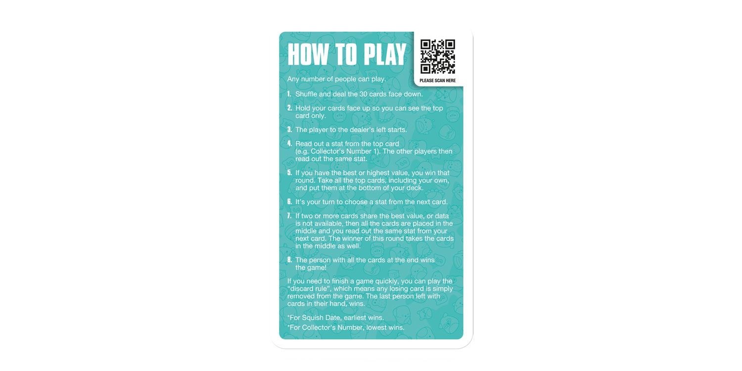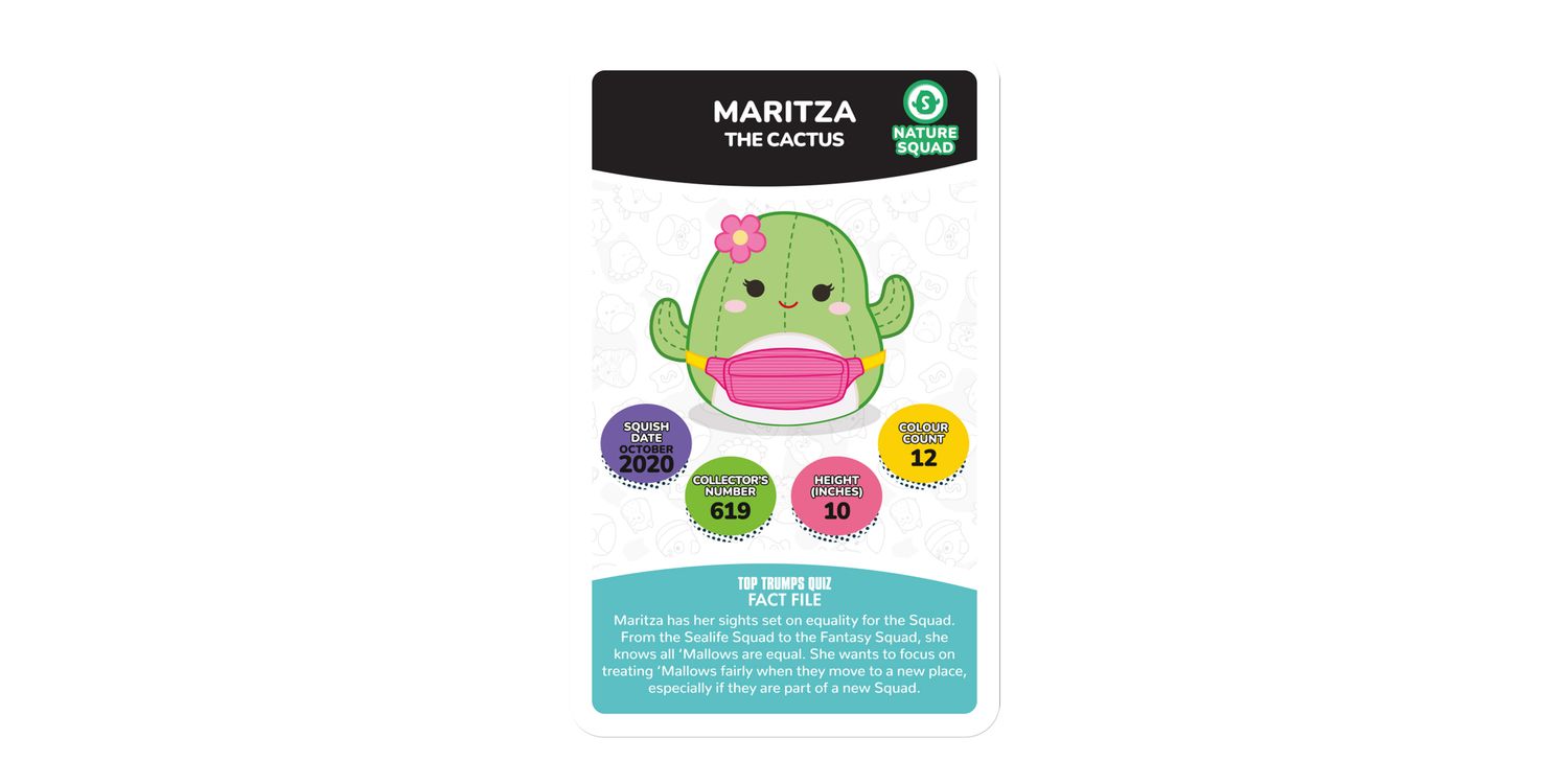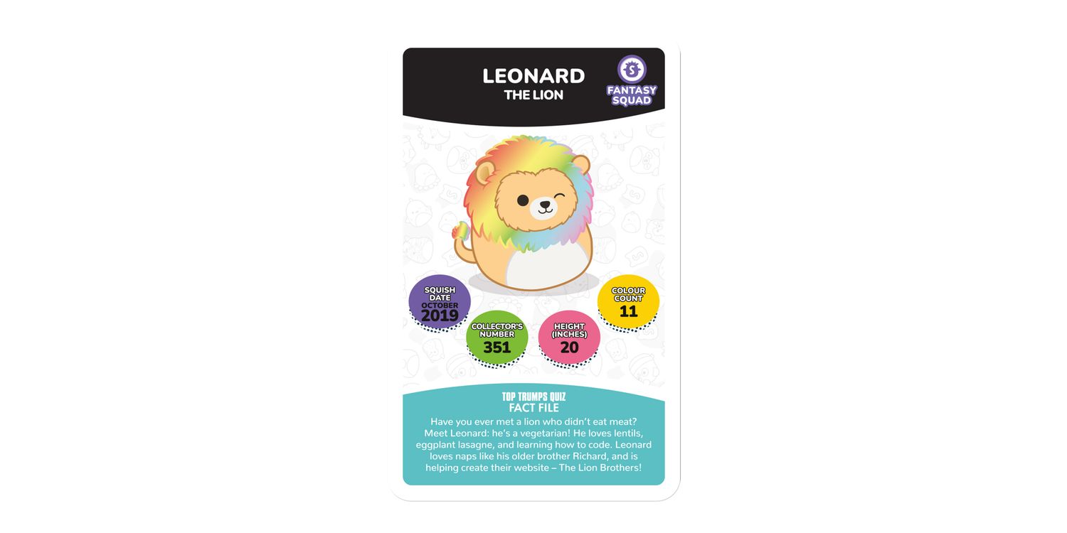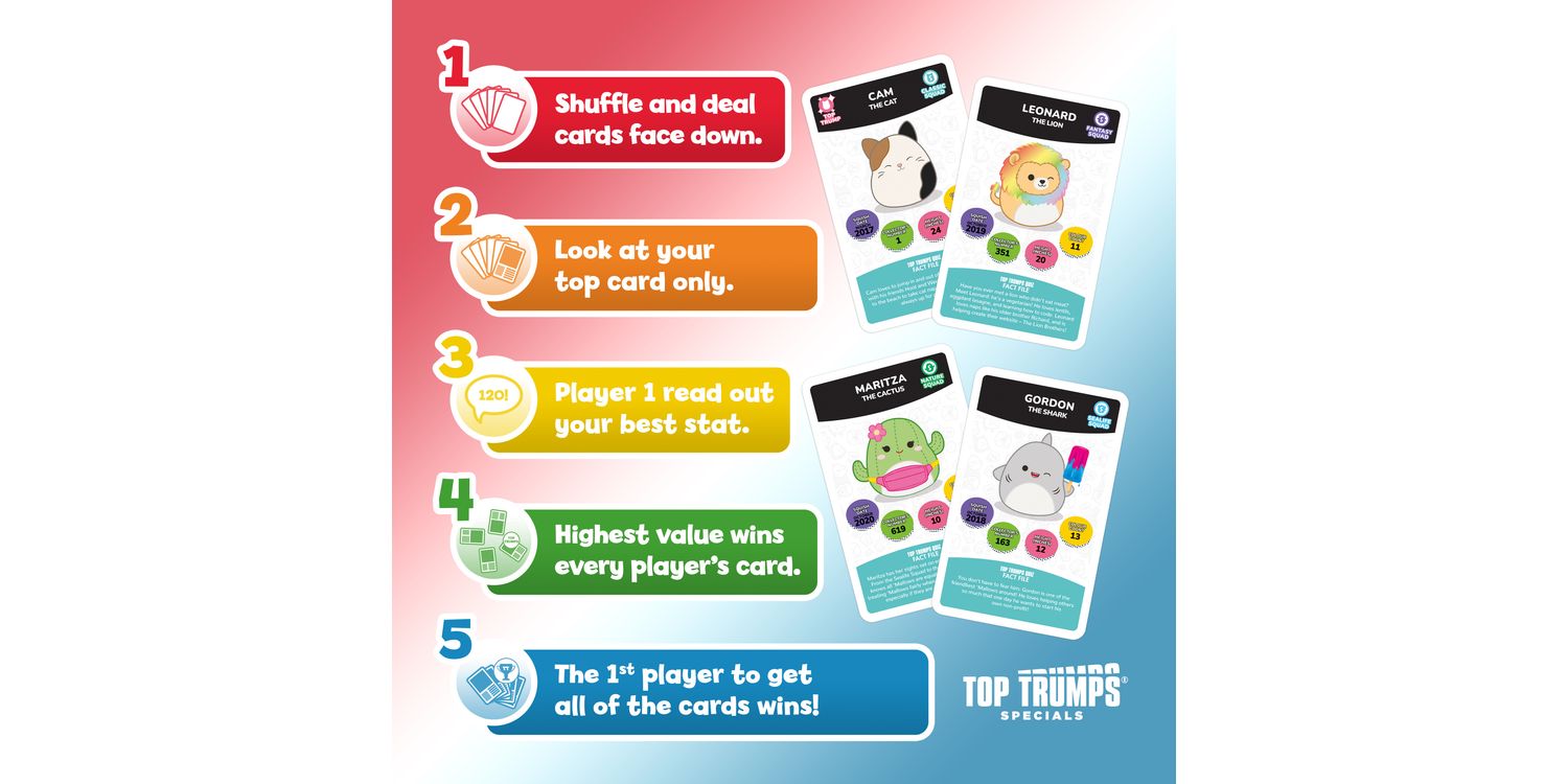 Join Cam the Cat, Winston the Owl, Lola the Unicorn and Fifi the Fox in the plushiest edition of Top Trumps Specials yet! Battle it out with your friends and family using 30 of the squishiest squad members around and claim every card for your own. Pick your best stats from categories including Squish Date, Collector's Number, Height and Colour Count; will Wendy the Frog's Collector's Number help you leap to victory, or will Benny the Bigfoot's Squish Date stat help you stomp your opponents? Maybe Prince the Pug's Height will help you become top dog! Each card features official artwork and a custom bios that tell you everything you need to know about your favourite friends. Whether you're a Top Trumps fan or an avid collector of these cuddly companions, this deck of Top Trumps is sure to delight and entertain players for hours, so shuffle your cards and use your knowledge of this beloved collectable craze to win! Squishmallows plush toys come in all shapes and sizes from large to small, and belong to different squads like Classic, Fantasy, Sealife, Prehistoric and more. This popular toy range also features characters like Disney's Stitch and Harry Potter-inspired Gryffindor Lion, Slytherin Snake, Ravenclaw Raven, and Hufflepuff Badger.
