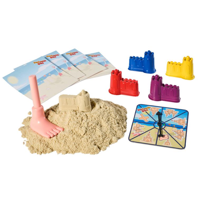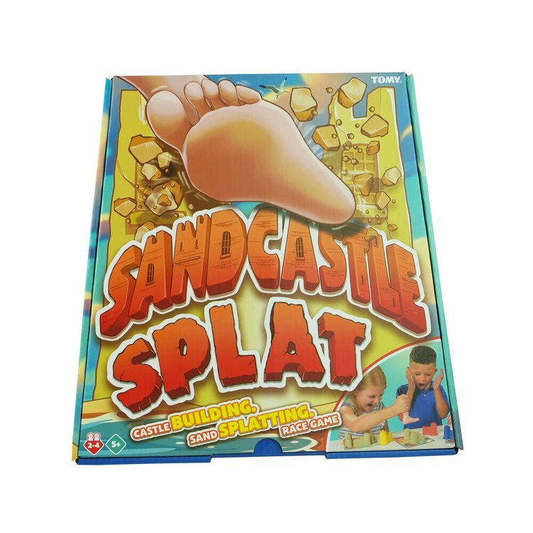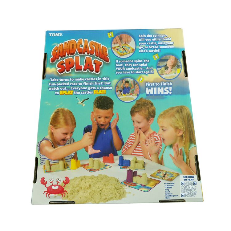 Take turns to make castles in this fun-packed race to finish first! But watch out… Everyone gets a chance to SPLAT the castles FLAT! TOMY is proud to present Sandcastle Splat. Build, spin and squash to win! It’s real-sand fun for everyone age 5 and over. Comes with four moulds, building bases, play sand, spinner and a splatting foot! Ideal for any family with a child or kids. The game also makes a perfect gift for adult friends on game night.
