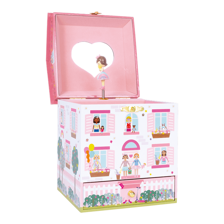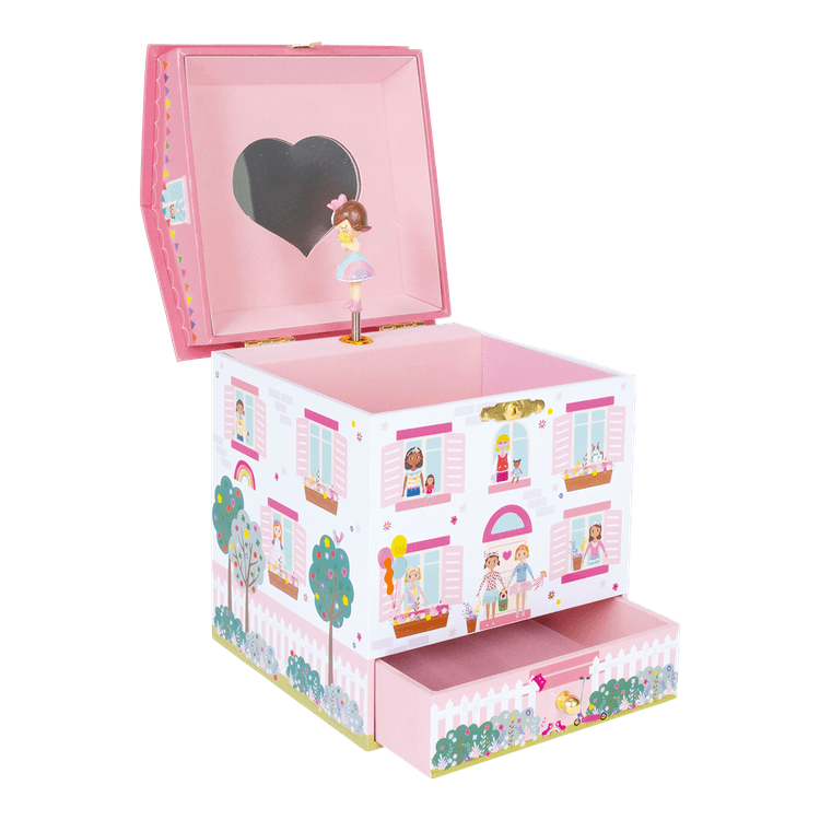 Open the lid to see a beautiful heart shaped mirror and twirling dolly, dancing to the tune ‘It’s a small world’. The handy drawer is perfect for all treasures and trinkets. Also included is a lovely glossy, coloured packaging box. Turn the winder and open the lid to hear the music play Dancing dolly twirls to ‘It’s a small world’
