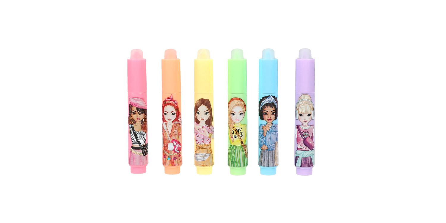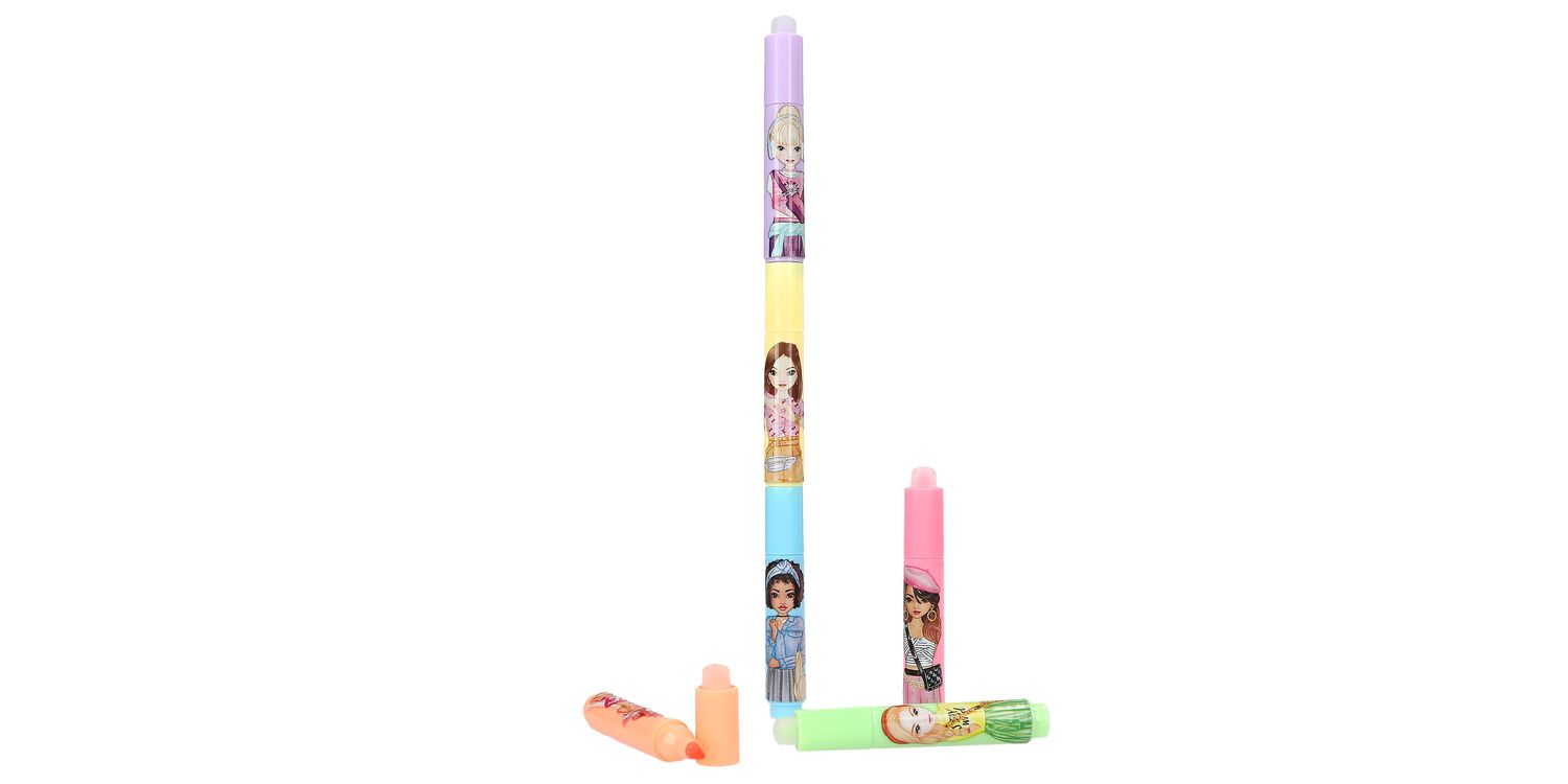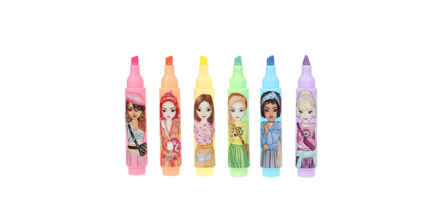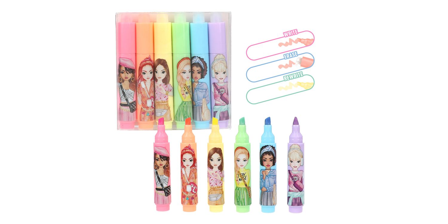 Mini highlighter from TOPModel (pink, orange, yellow, blue, green, purple) for erasing and assemble The mini highlighters from TOPModel are a highlight in the truest sense of the word: they can be easily erased with the round sharpener on the cap. 6 different colours: pink, orange, yellow, blue, green, purple. Each with a cool TOPModel print on the pencil.
