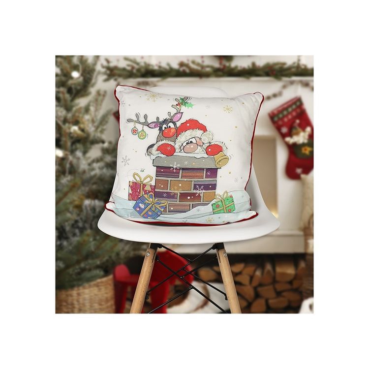 Featuring a fun depiction of Santa in a chimney with Rudolf in the background. This cushion is ready to place on your sofa, bed or favourite chair to bring a touch of Christmas cheer to your home.