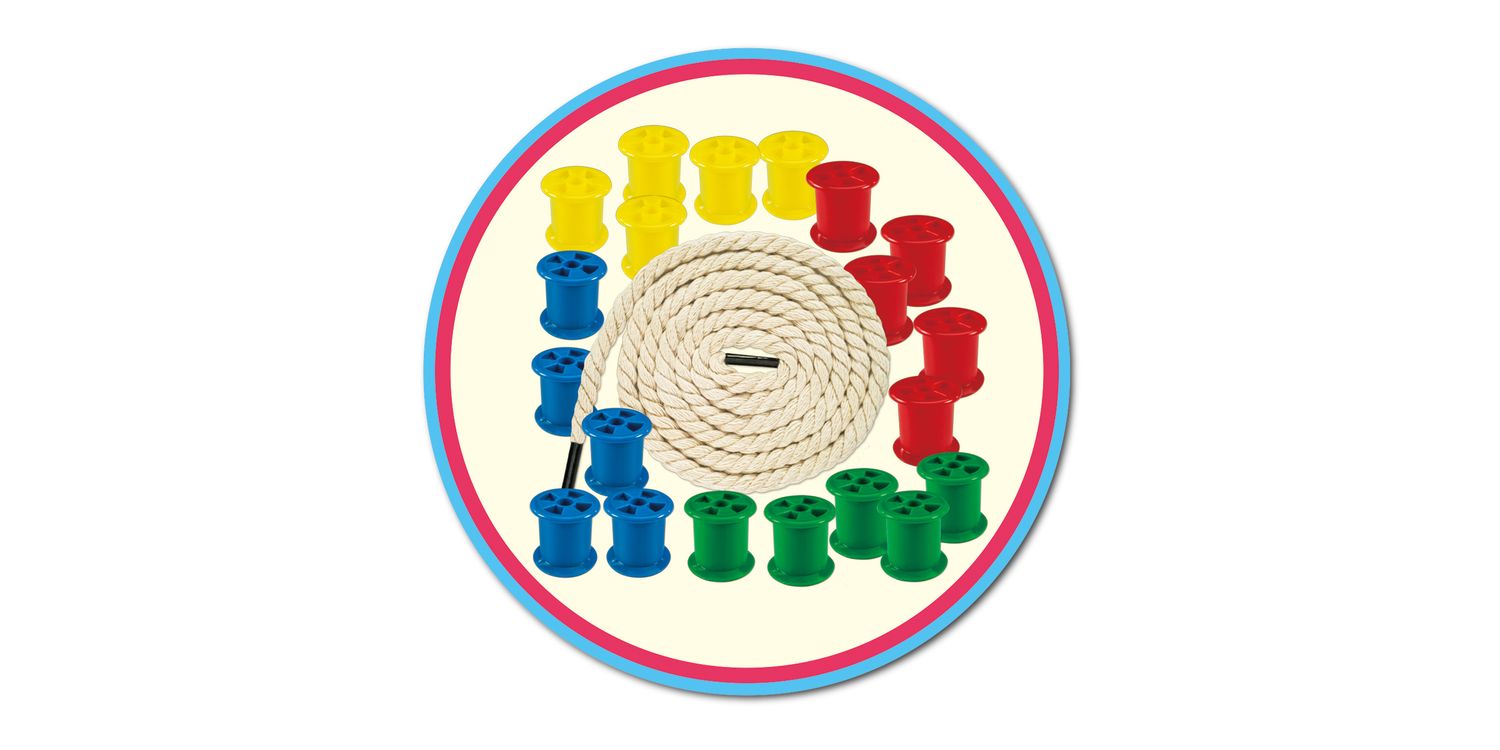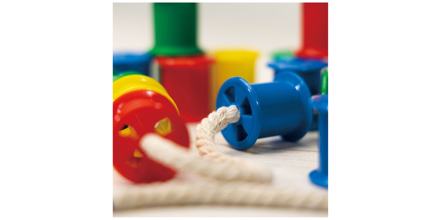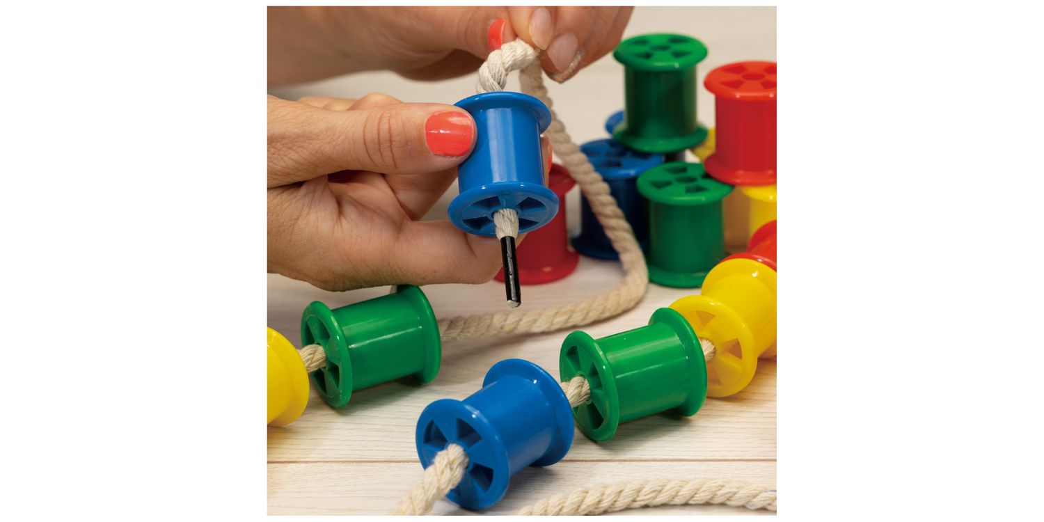 Set of 20 cotton reels in 4 bright colours plus a chunky threading cord. Ideal for threading and stacking to encourage hand - eye coordination and manual dexterity. Progress to colour sorting and counting with this versatile toy. Made from tough, durable plastic.