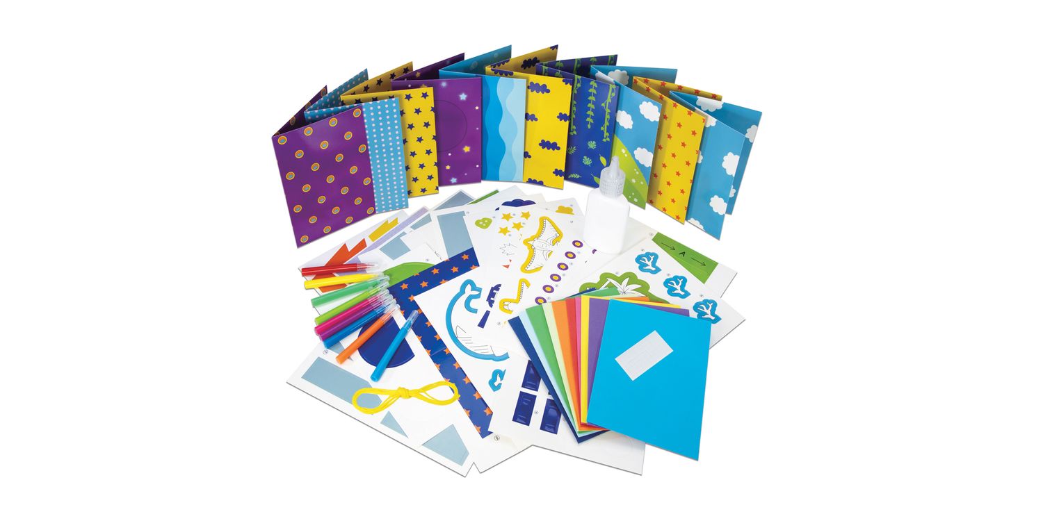 Contents: 10 printed cards, 10 coloured envelopes, pre-cut card pieces, 9 mini fibre pens, glue, thread, adhesive foam pads and step-by-step guide.