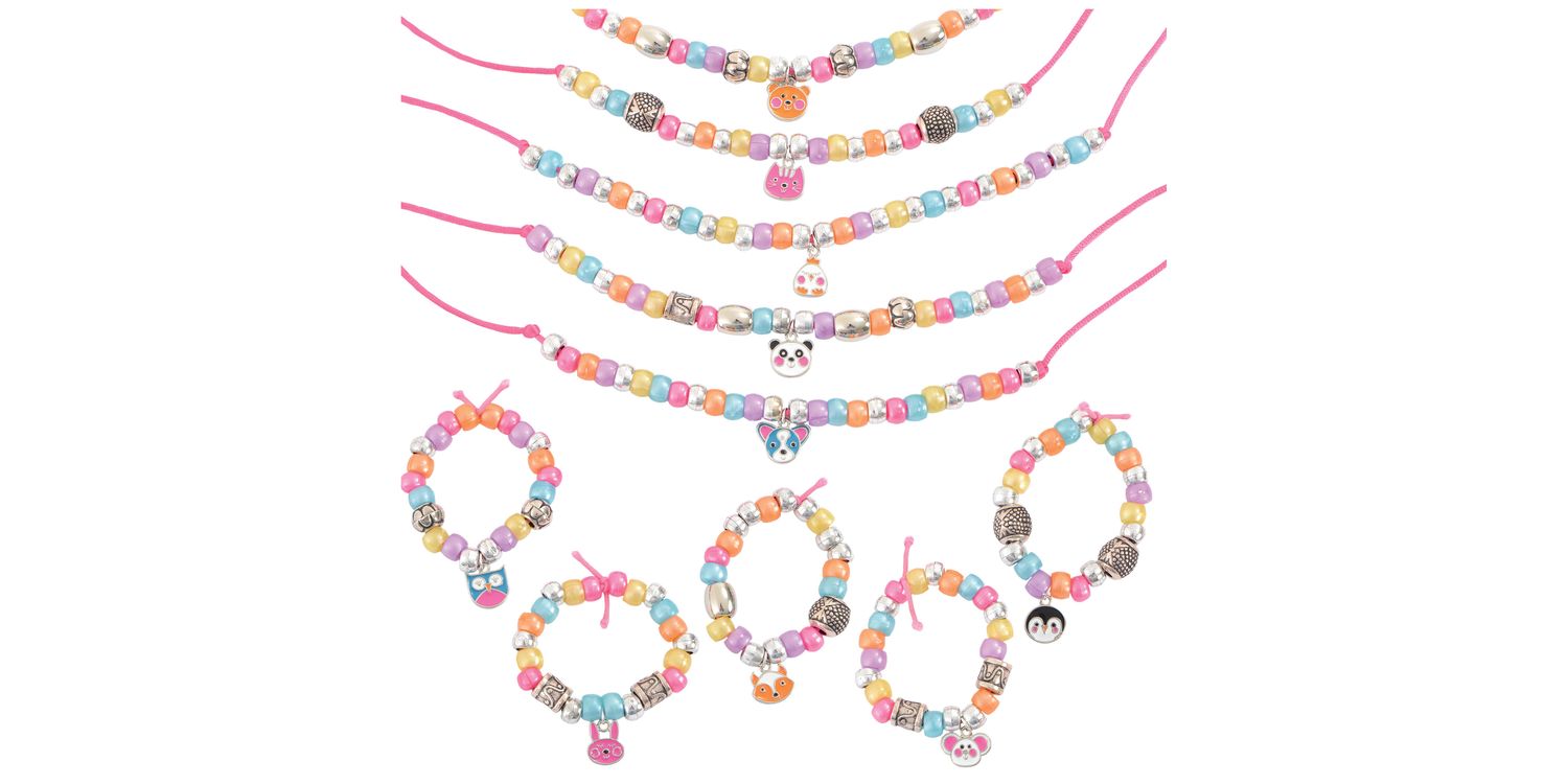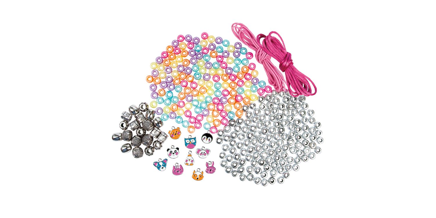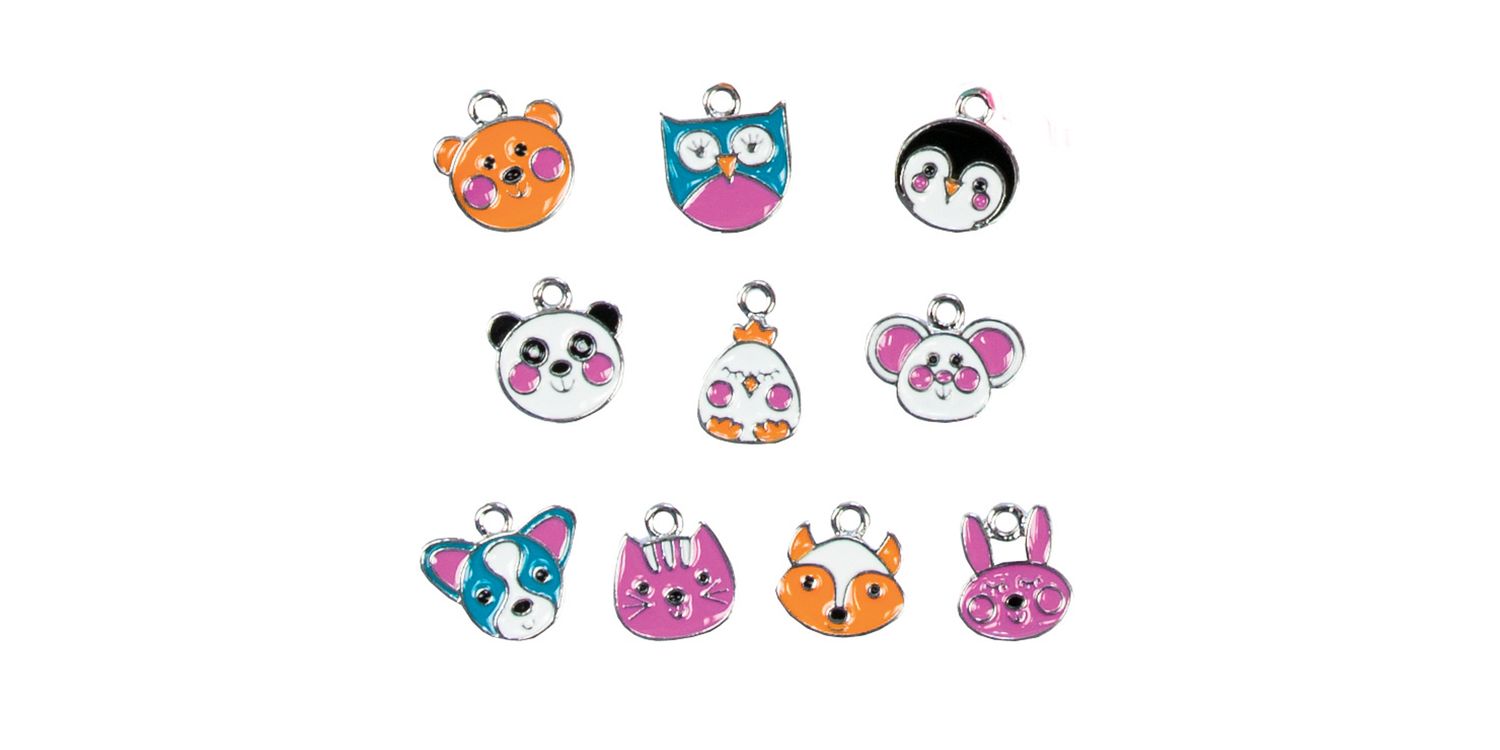 Make cute animal jewellery with 10 coloured metal charms. Simply thread the elastic or cord through the rings on the charms and combine with the silver and coloured beads to make cool necklaces and bracelets. Fun to make and to wear. This kit includes 10 coloured metal charms, 20 decorative silver beads, 150 coloured and 130 silver pony beads, silky cord, elastic and guide.