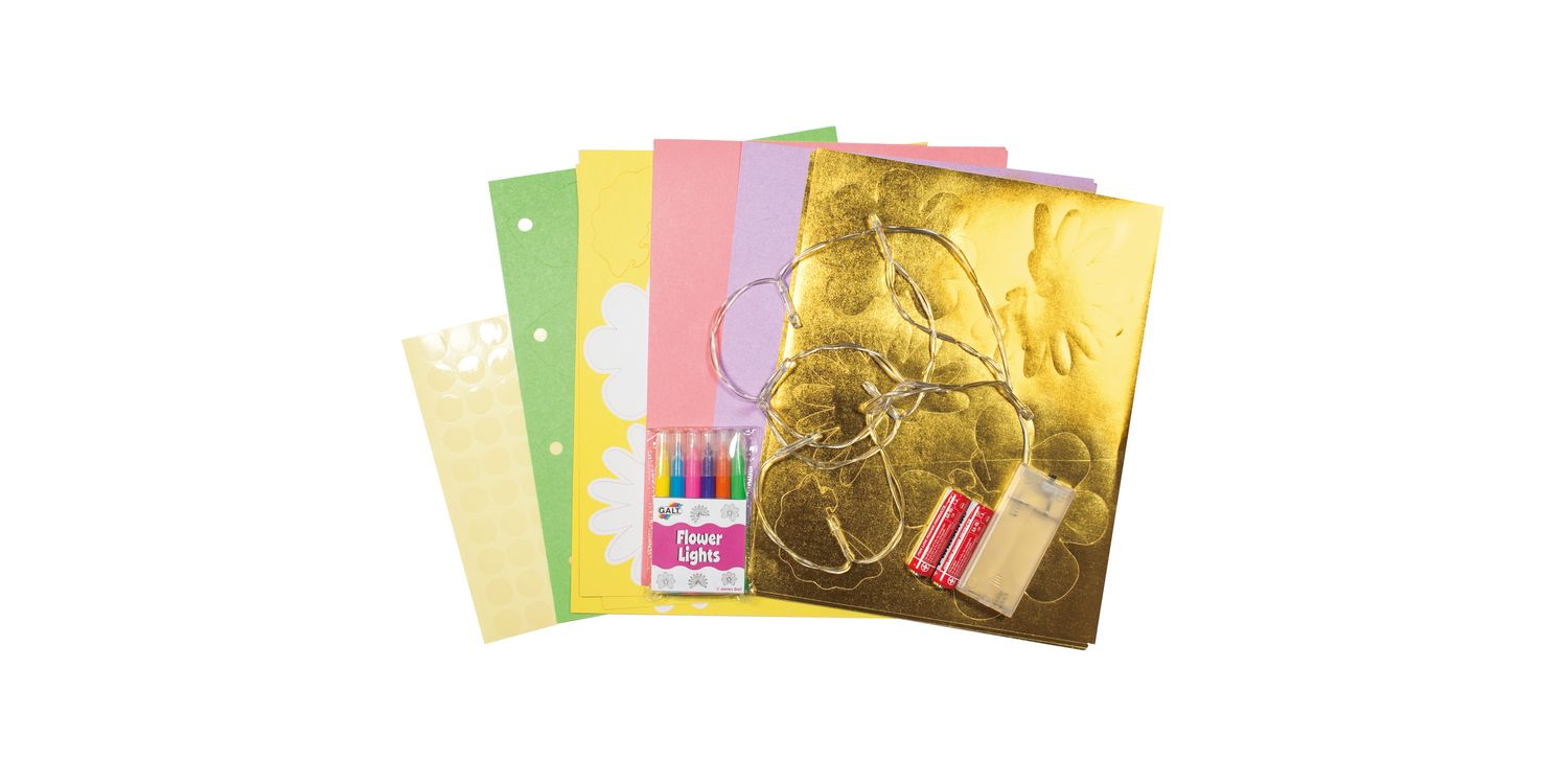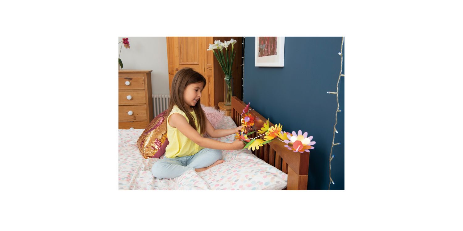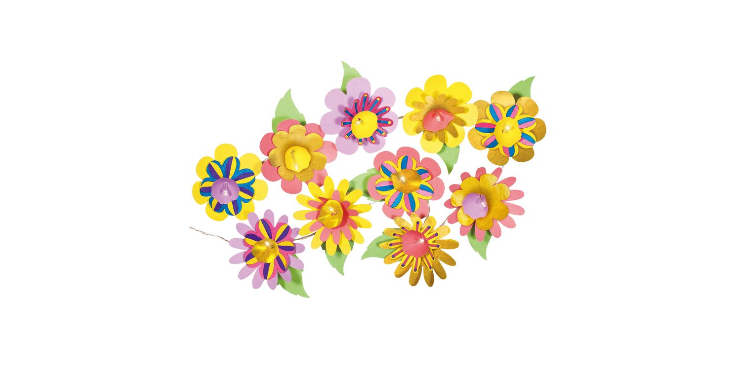 Make an amazing string of 10 flower lights to decorate your room. Customise your look by colouring in the patterned flowers, then layer up with coloured and metallic petals around each LED light to create a dazzling display.