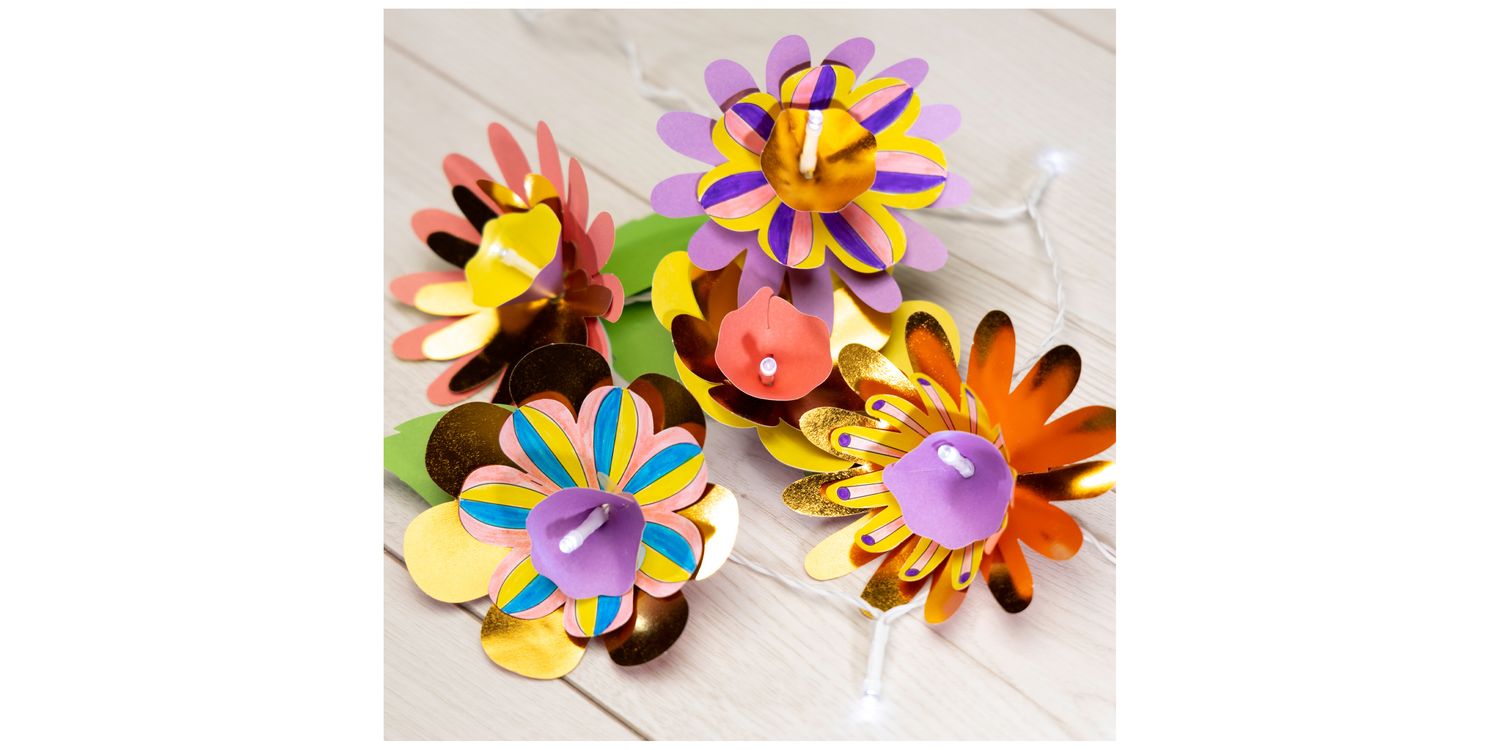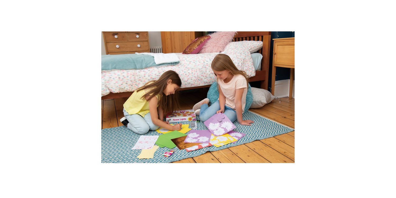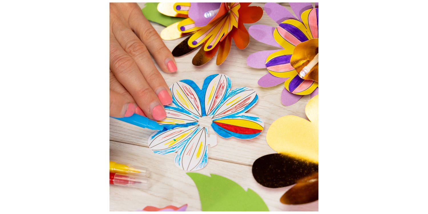 Make an amazing string of 10 flower lights to decorate your room. Customise your look by colouring in the patterned flowers, then layer up with coloured and metallic petals around each LED light to create a dazzling display.