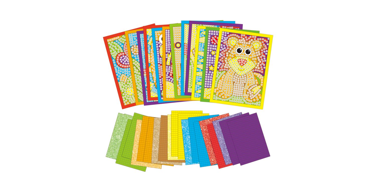 Contents: 20 foam sheets (coloured and glitter) with over 7500 self-adhesive 6mm (¼") tiles, 12 tile by number colour pictures – size 25 x 18cm (9¾" x 7") and guide.