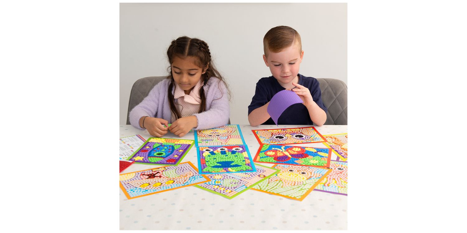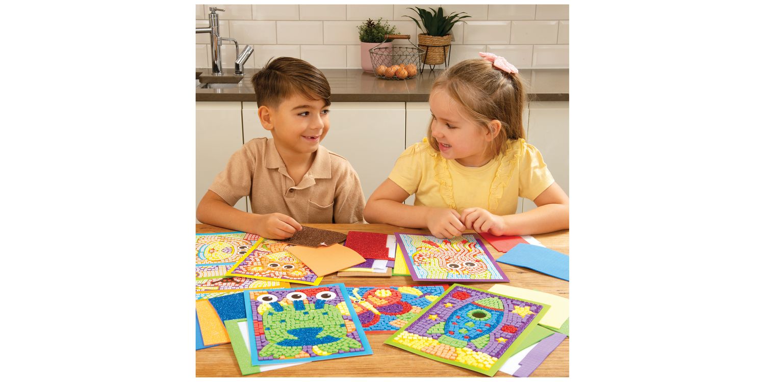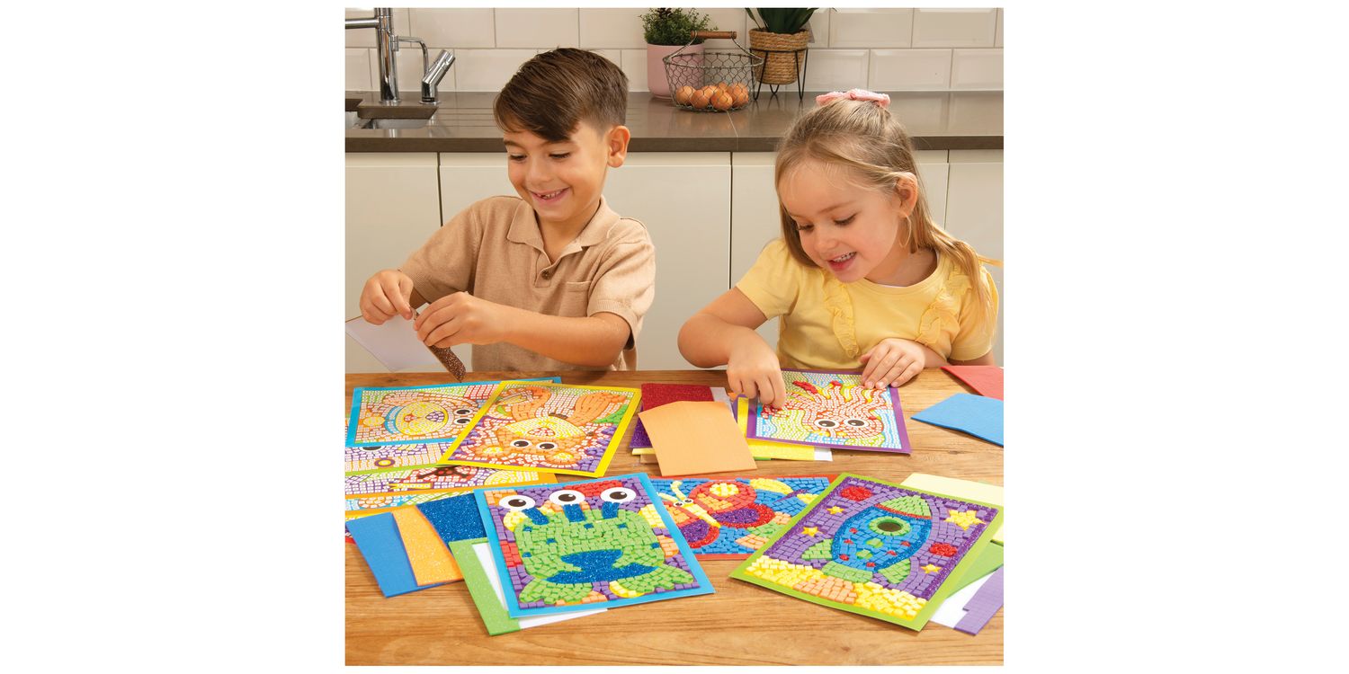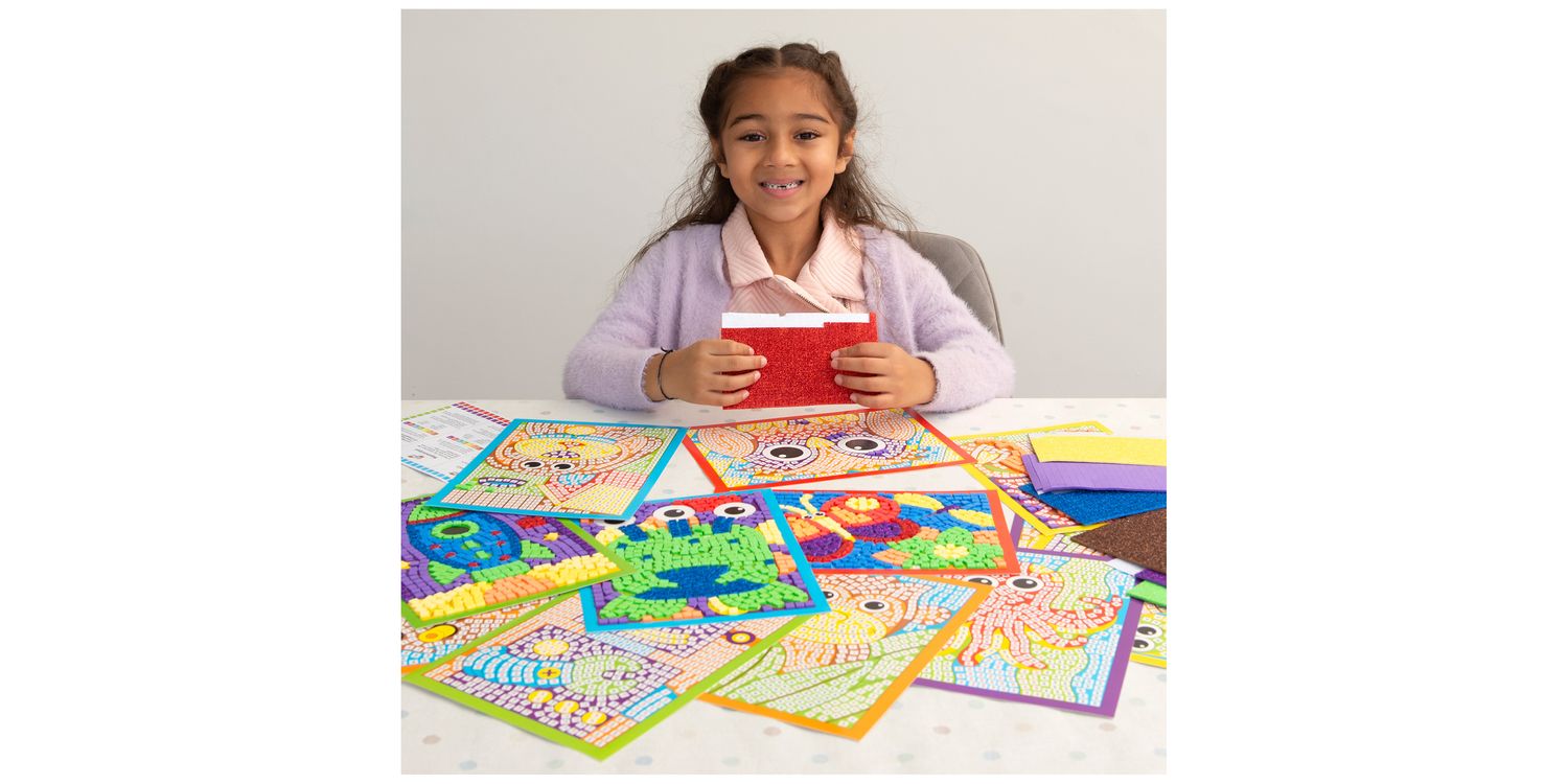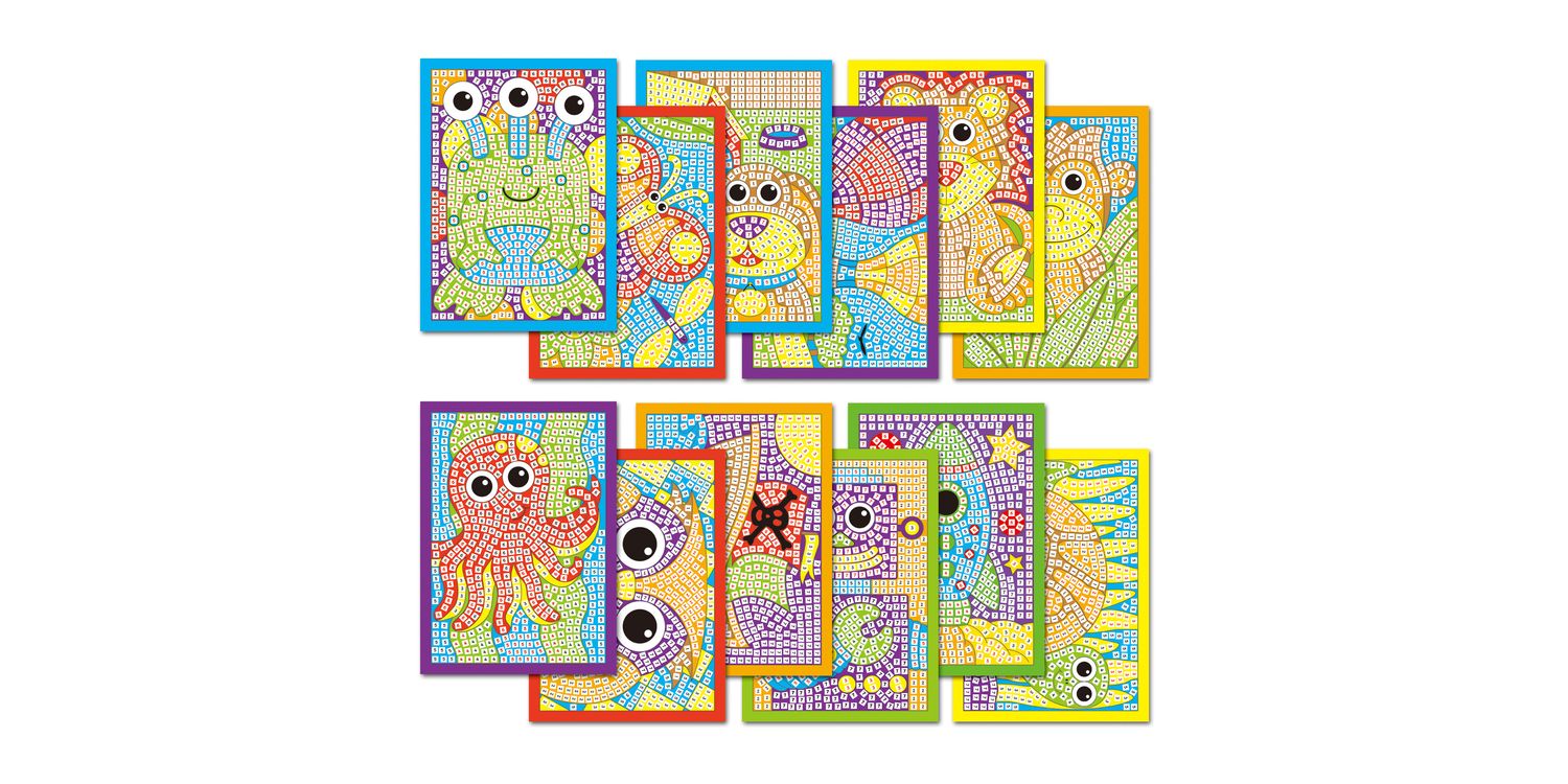 Make 12 fun mosaic pictures with coloured and glitter foam tiles. Simply tile by number, matching the colour of tile to its number on the picture. Peel the backing off the tiles and stick on the picture to create your mosaic pictures with no glue required.