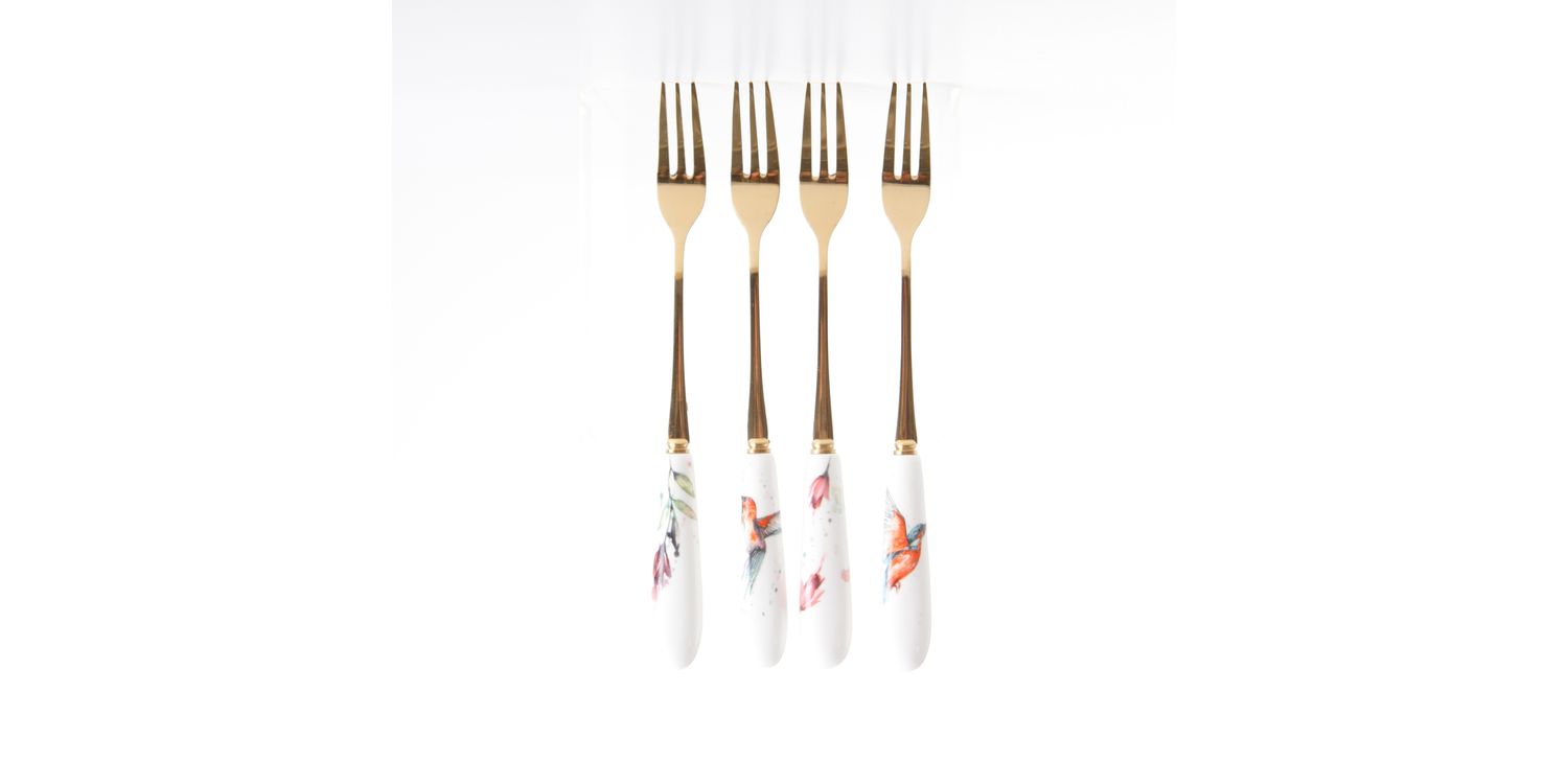 Meg Hawkins - The Elegance Collection Cake Forks. The Rainforest Humming Watercolour Design Cake Forks by Meg Hawkins. Adorned with stunning watercolour artwork of a hummingbird and kingfisher’s, this forks add a touch of nature-inspired charm to any space. Crafted from fine china, a beautiful yet practical addition to your tabletop, it also makes a thoughtful gift