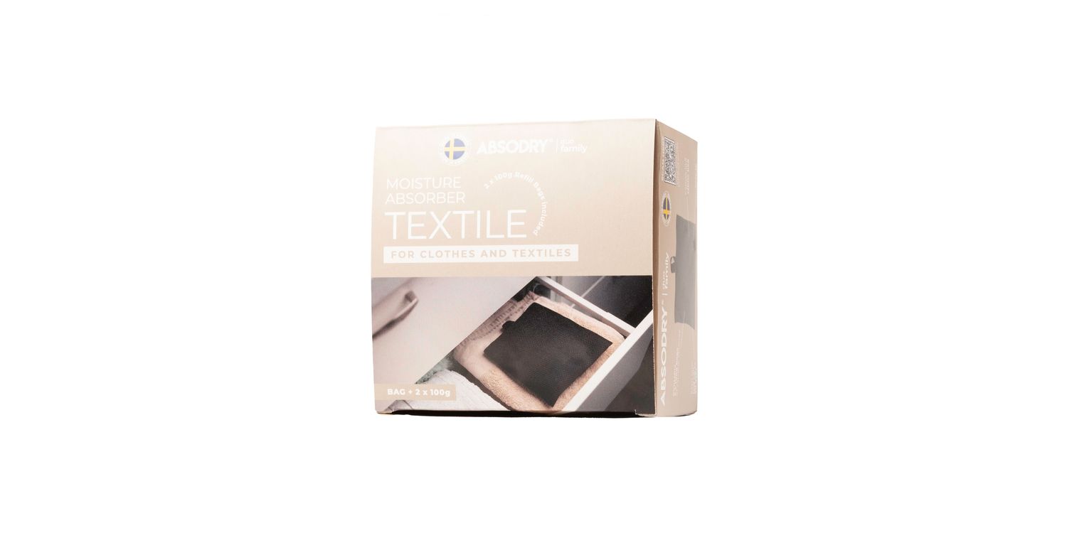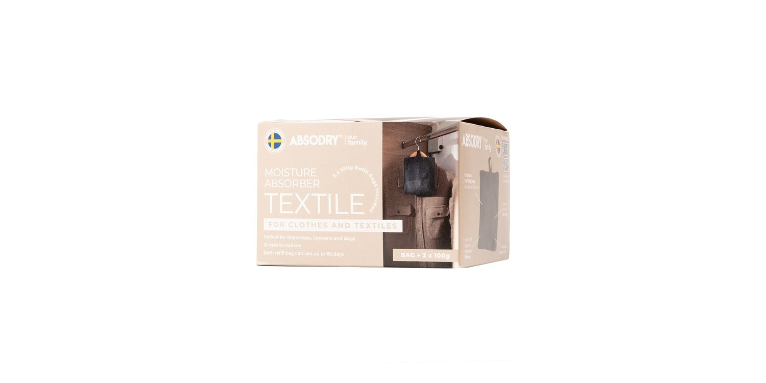 The crystals absorb excess moisture in the surrounding air, which condenses into gel in the container. Absodry Duo Family Textile balances the humidity in its surroundings and make the air optimal for our living conditions. It not only absorbs moisture and creates a pleasant indoor air, but it also works silently to counteract bad odours and mould.