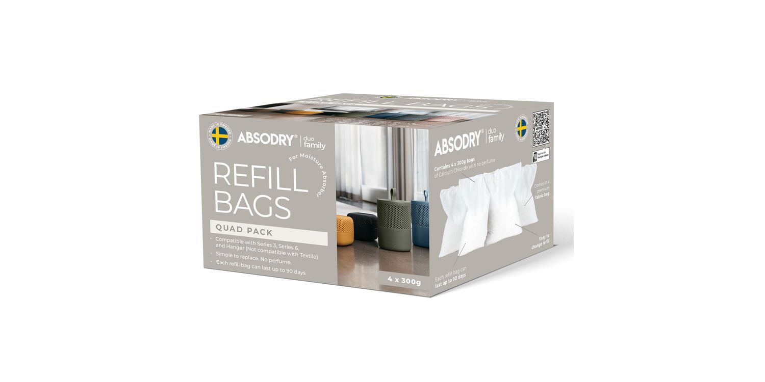 The Duo Family Refill is a 4-pack of 300g refill bags with moisture-absorbing crystals. One bag lasts 1-3 months depending on the humidity where it is placed. Suitable for spaces up to 50 m3. The special crystals in the bag absorb excess moisture that condenses into water in the container and balances the humidity in its surroundings.