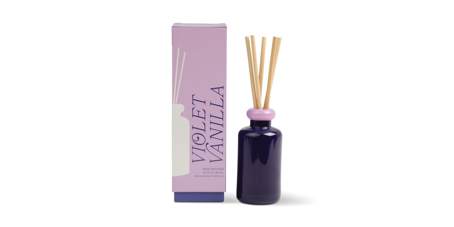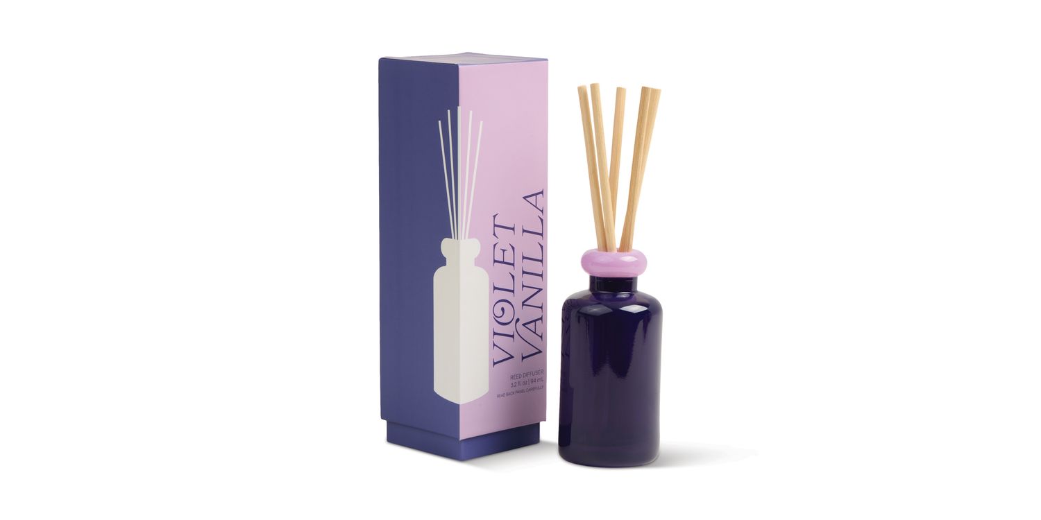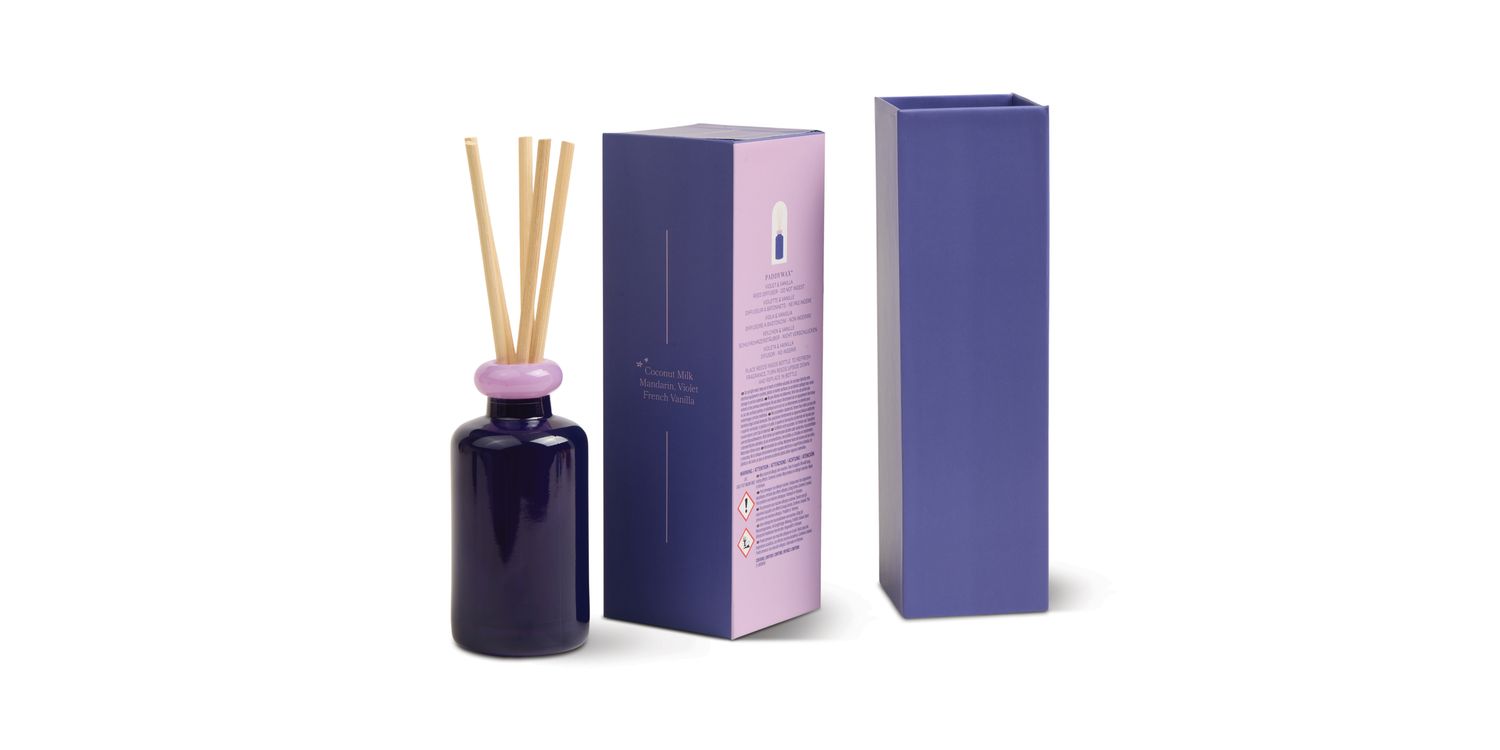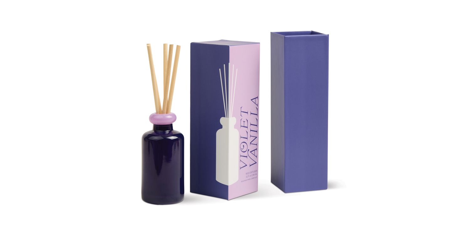 Diffusers come packaged with natural reeds in a bold sliding box.