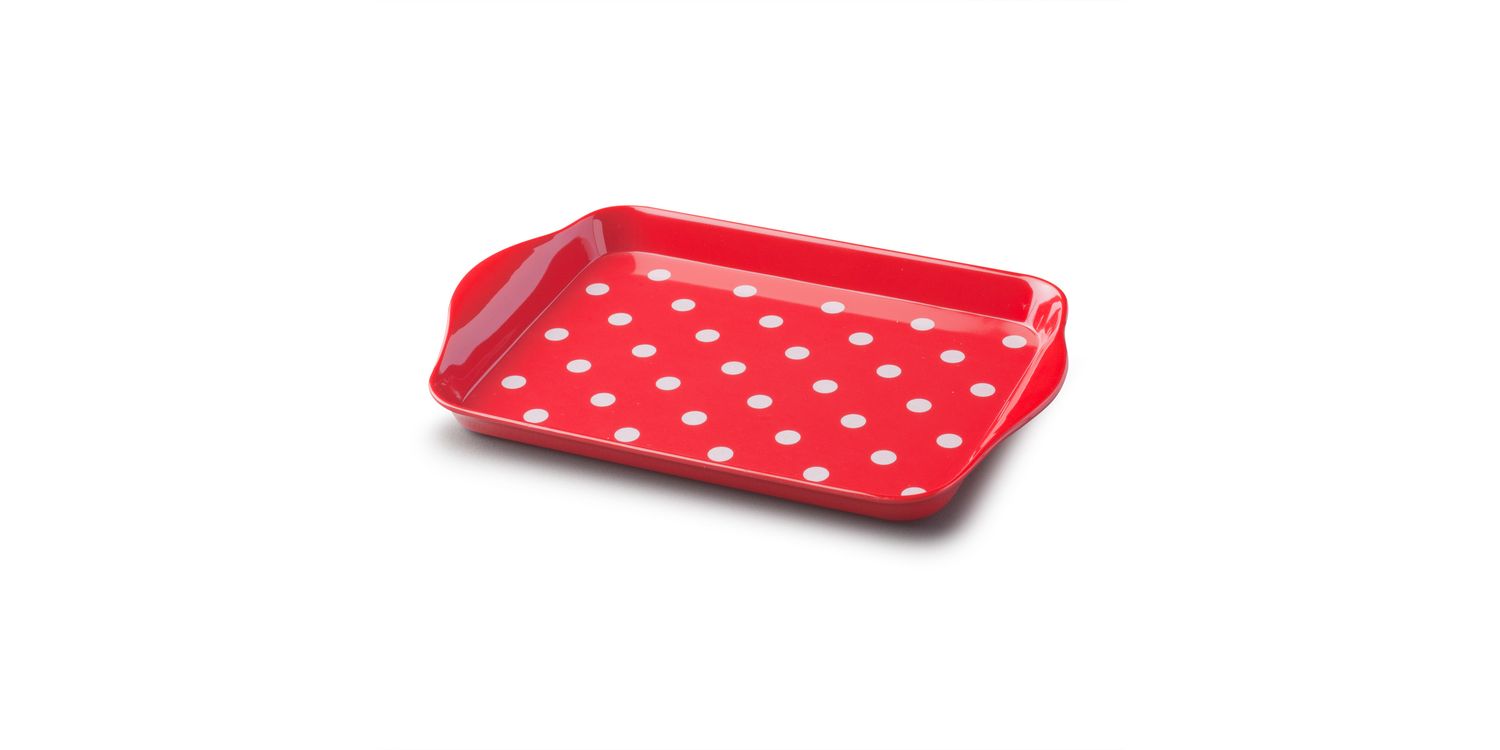 A classic style tray with a cool, retro polka dot pattern. Stackable with raised lipped handles.