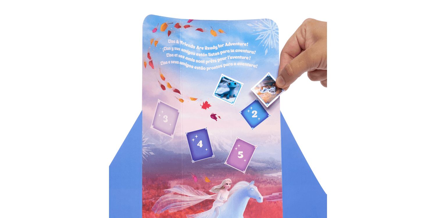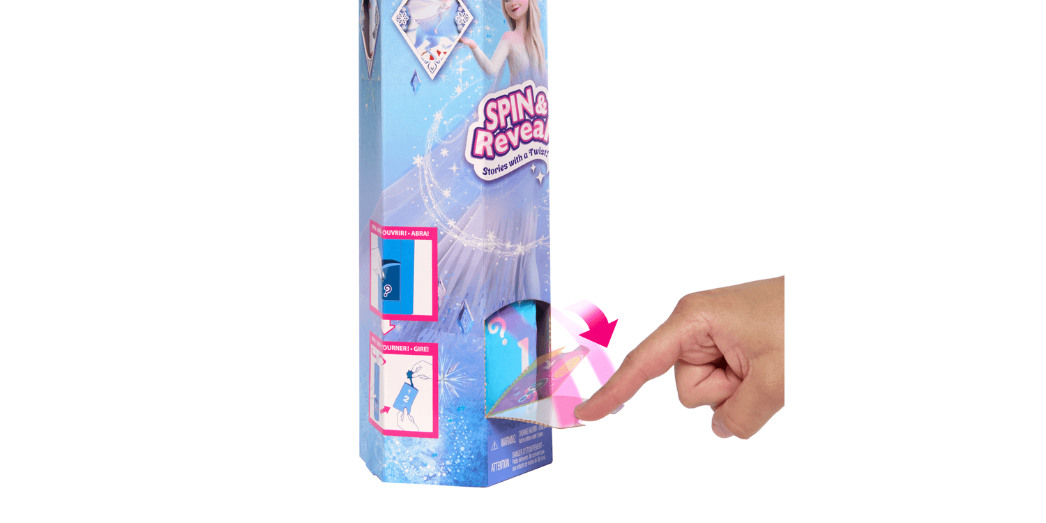 Disney Frozen Elsa gets a magical twist in this Disney Frozen Spin & Reveal unboxing experience! First open the snowflake to reveal a themed play scene with mystery silhouettes. Next spin the package to find 5 mystery bags filled with 5 accessories and 5 stickers. The final reveal is an Elsa fashion doll in a beautiful movie-inspired outfit! Kids can also decorate the play scene and imagine stories with it as a backdrop. Doll cannot stand alone.