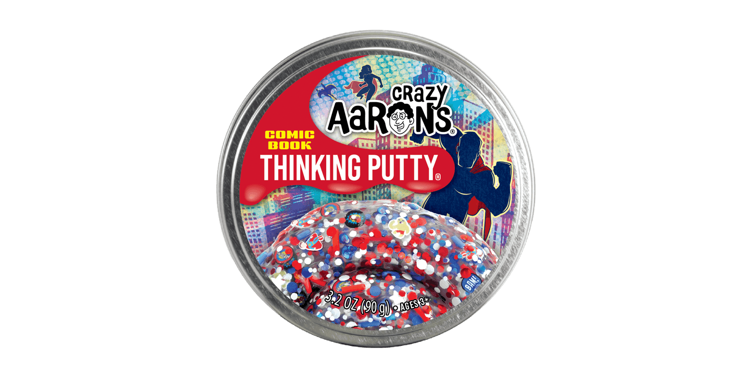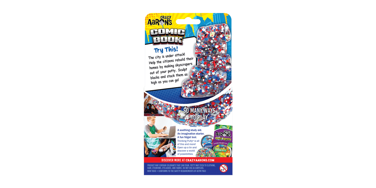 Save the day with Comic Book Thinking Putty! This super powered putty has all the thrilling elements of an animated picture book exploding with character pieces and call outs to stretch and smoosh for fidget WOW.