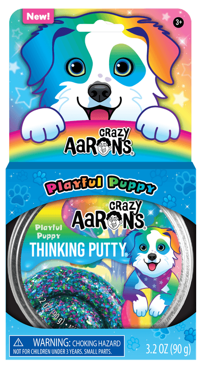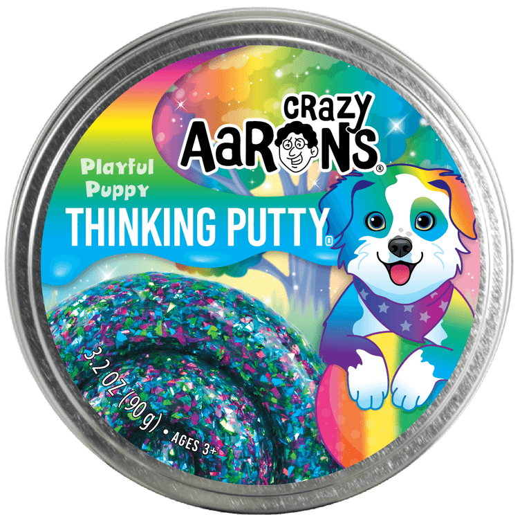 Meet the puppy that loves to play all day in the park. He chases around his rainbow ball until it gets dark. Roll your Thinking Putty up so it's nice and round, this Playful Puppy will be so happy to see you bounce it around.