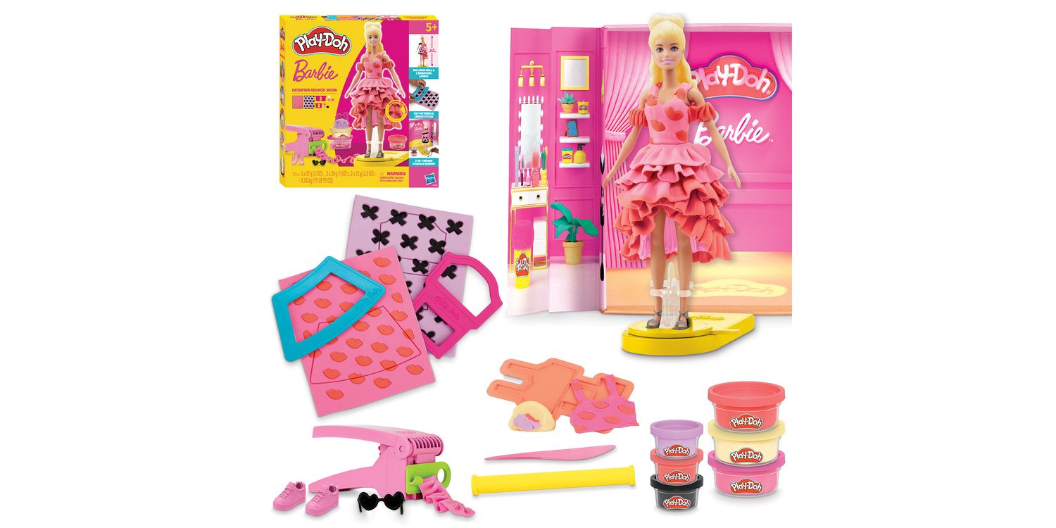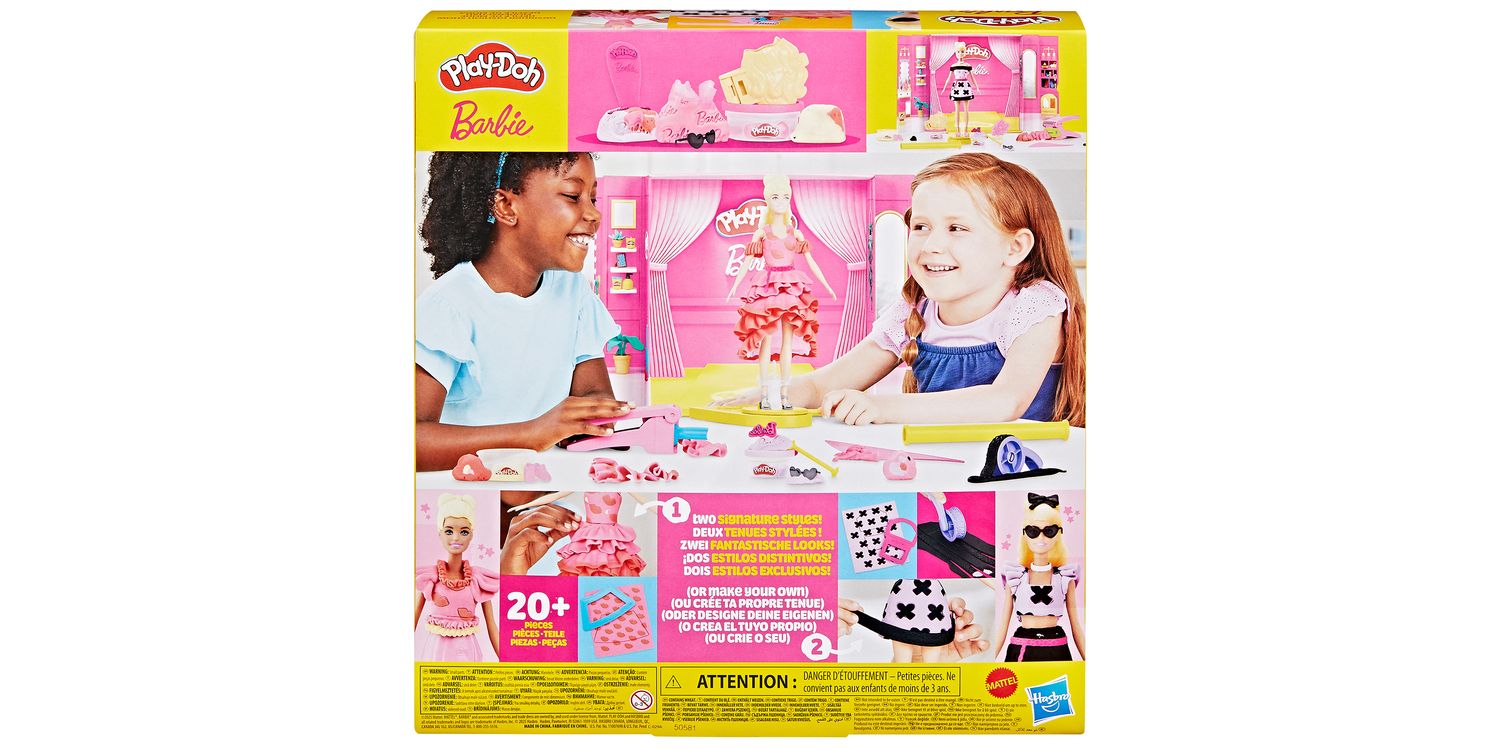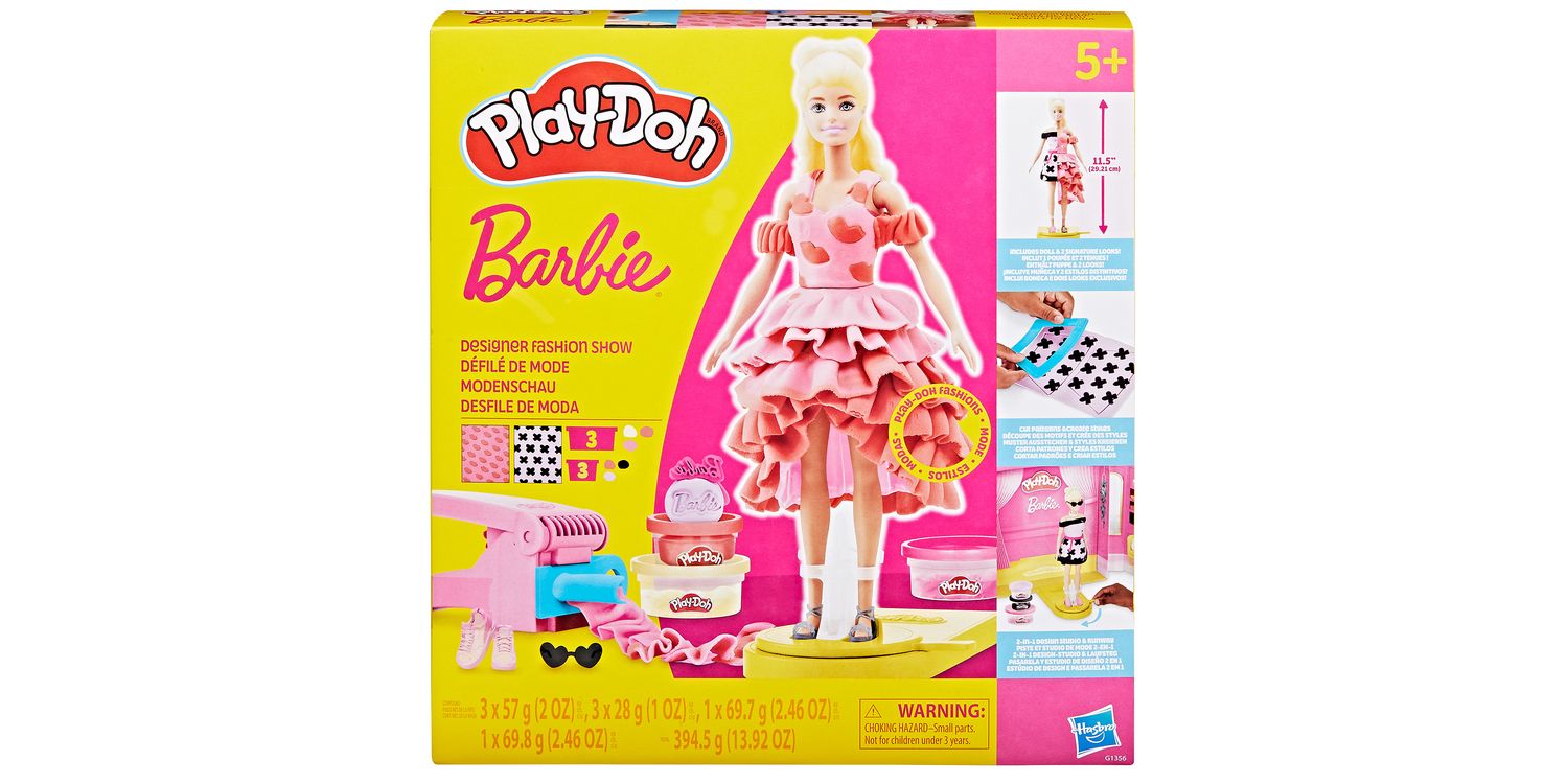 Includes Barbie doll, runway playset, doll stand, ruffle maker with 2 rails, 2 hair moulds, 2 underskirts, Barbie logo stamper, 2 cutters, bow stamper, 2-sided stamper, rolling stamper, necklace accessory, 2 pairs of shoes, belt, sunglasses, knife, roller, 2 Play-Doh Pattern sheets, and 5 cans of Play-Doh Brand Modelling Compound (total 13.92 oz/394.5 g).