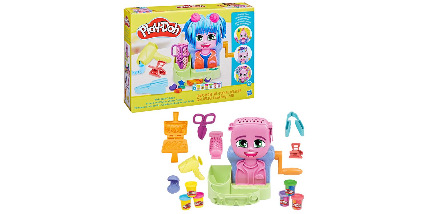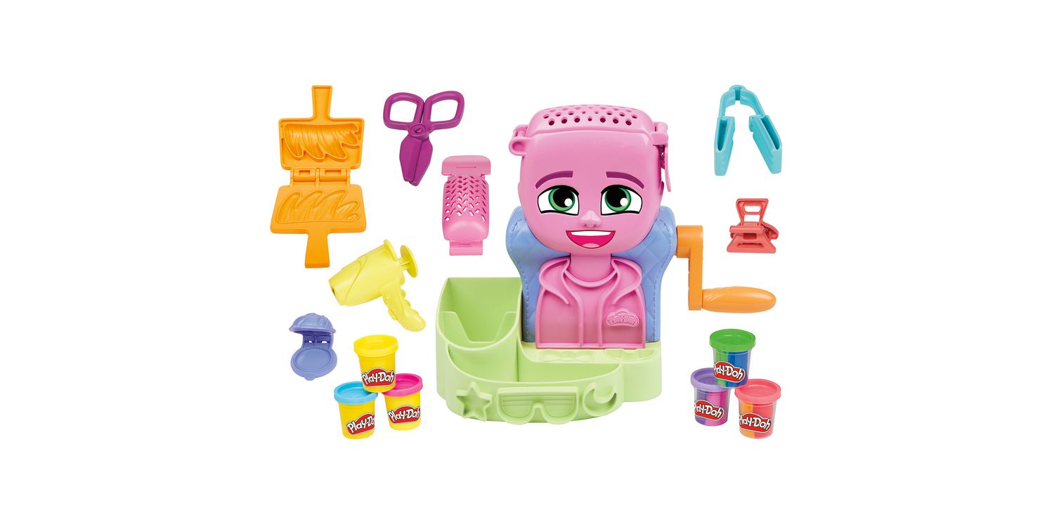 This Play-Doh kit includes lots of fun Play-Doh accessories like a curl-creating hair dryer, mohawk mold, crimper, and 2 different plates to make different hair textures.