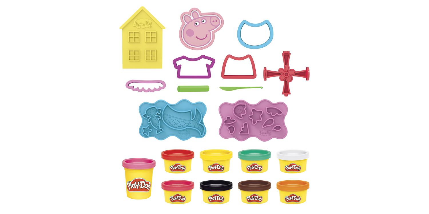 Inside the pack, children will find: 1x Peppa Pig stamper, 4x cutters, 1x 4-sided stamper, 1x house mould, 2x mould palettes, 1x roller, 1x knife and 9x cans of Play-Doh.