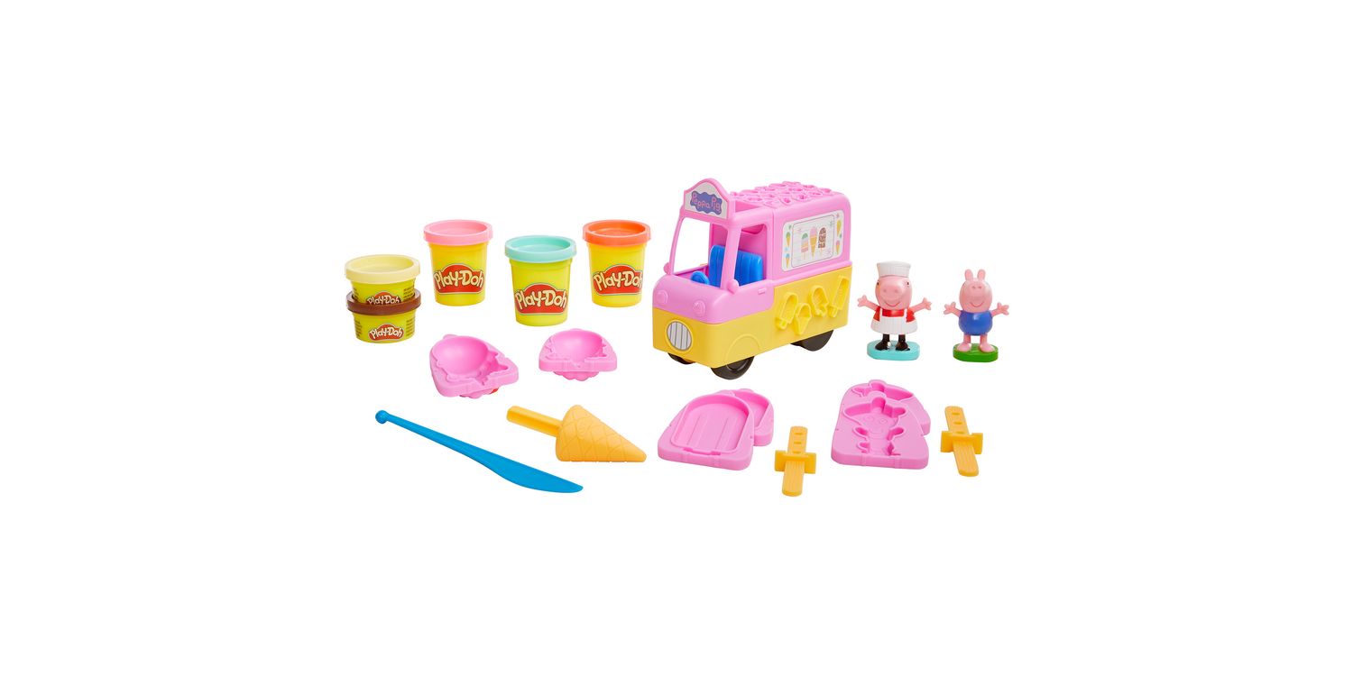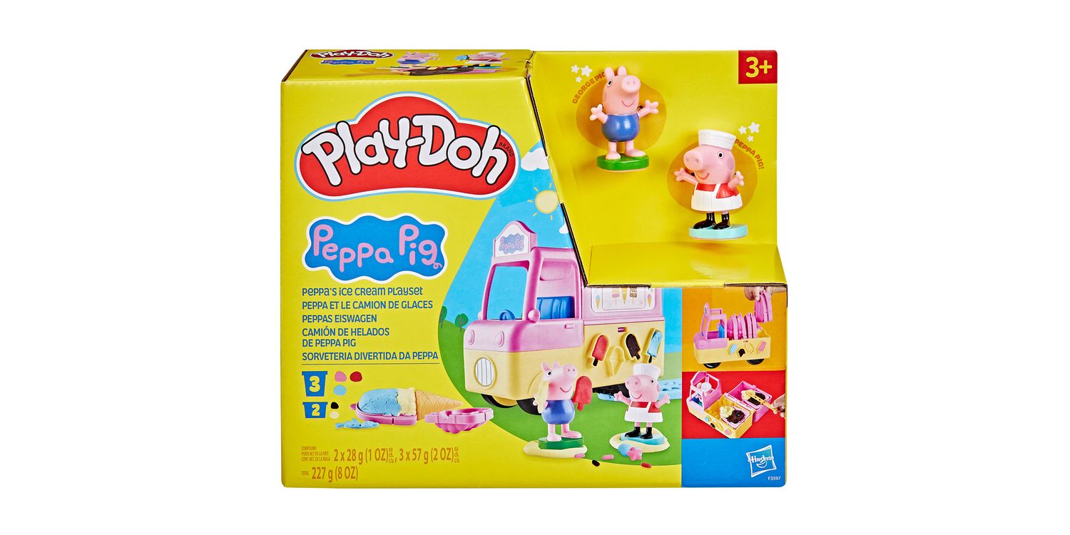 Peppa Pig and her brother George are ready for Play-Doh fun with this arts and crafts set for kids 3 and up! The figures can ride in the front of the truck, which has molds to make pretend goodies and back wheels that make syrup shapes. Kids can also make hand-held Play-Doh ice cream cones, ice pops, and teddy bear treats by snapping one of the 3 large molds into the back of the truck and filling it up.