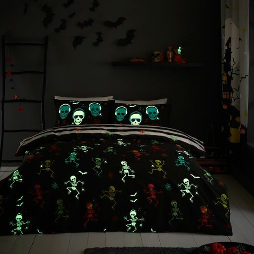 Trick or treat yourself and have a Happy Halloween with this wicked glow in the dark bedding. Printed on to an easy care poly cotton fabric, this duvet set featuring glowing dancing skeletons will ensure you have a spookacular bedtime.