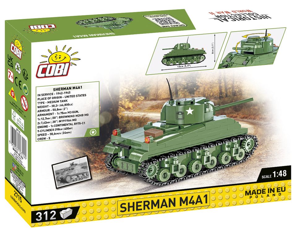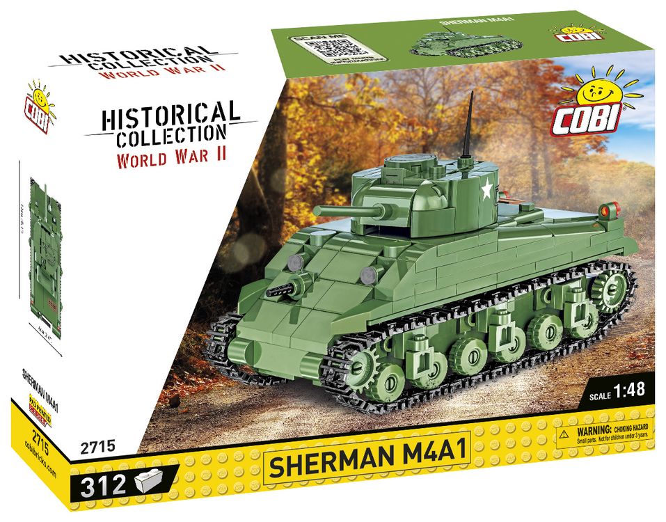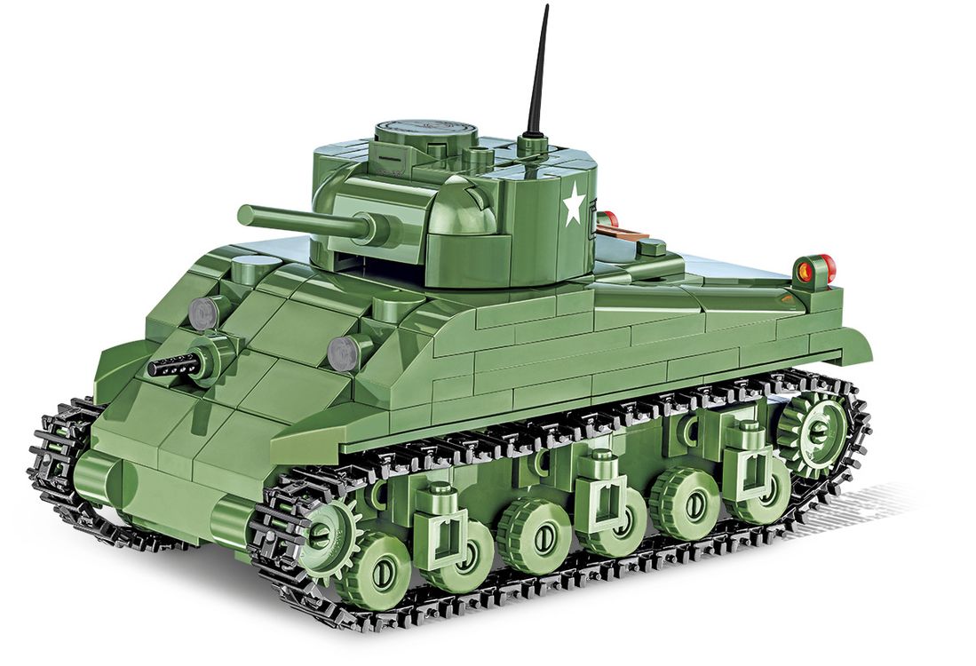 The M4 Sherman was the main American medium tank from the Second World War. Produced from 1942-1945, it became the most recognizable American tank. During the war it was dramatically developed. It was equipped with a 75mm cannon. The ammunition and the flammable engine initially made the Shermans an easy target for the heavier German tanks. Only after the construction was refined, the roles could be reversed. A total of approximately 49,000 of all versions of the Sherman were produced. The tank was used by, among others, the armies of the USA, Great Britain, Poland, France and the USSR. It had a reputation as a reliable, easy-to-manufacture and well-armed tank. A miniature Sherman M4A1 vehicle made of COBI construction blocks was produced in the 1:48 scale of models. It is easy to build and perfect for the beginning of an adventure with Polish COBI building blocks. It has a movable cannon, a rotating turret and a working caterpillar traction. All graphic details are high-quality prints that do not wear off even during intense play. The advantage is the design that uniquely reflects the original shapes of its historical inspiration. Thanks to our small series, your collection will fit anywhere! Our tanks are perfect for mature enthusiasts of military technology and everyone, regardless of age, who loves history and construction!
