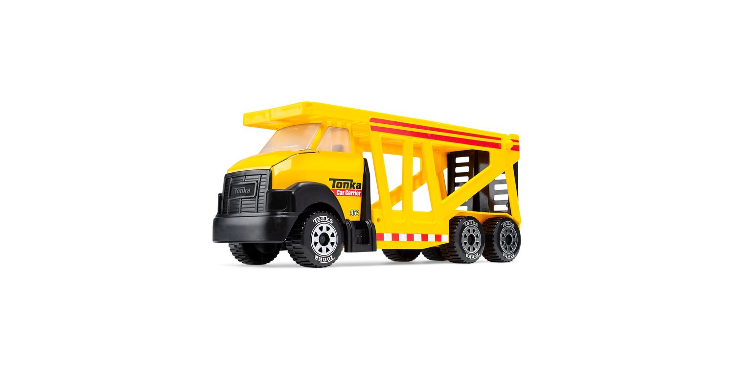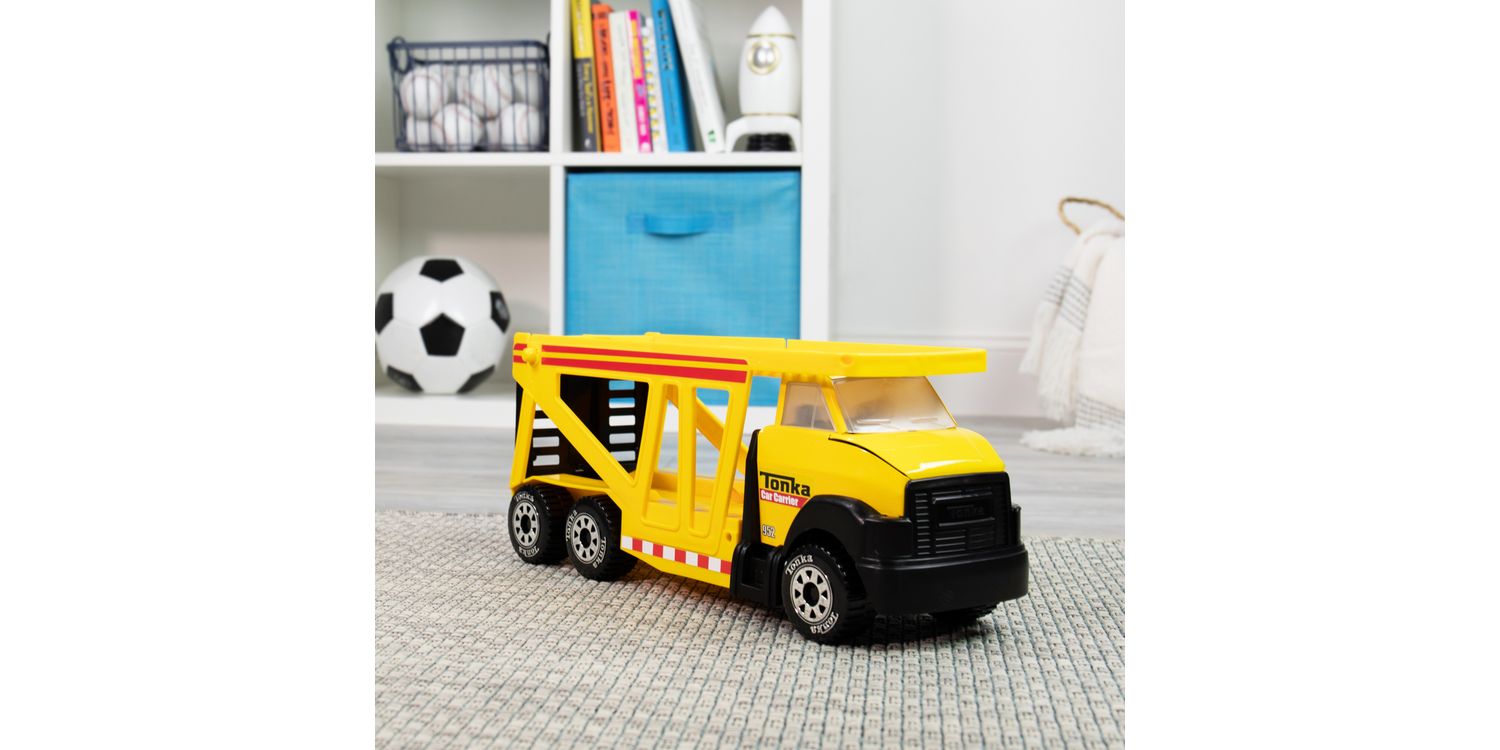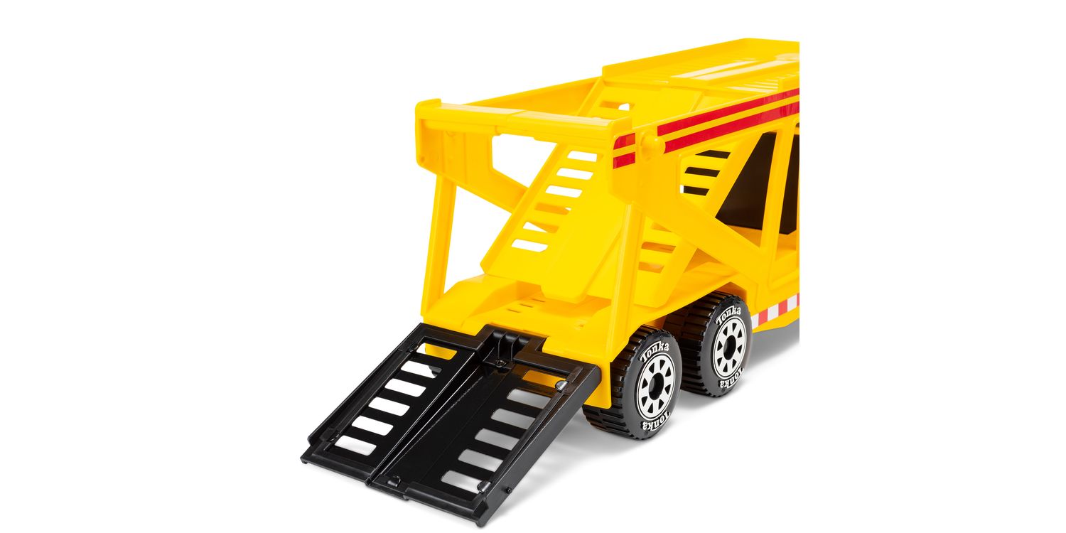 Introducing the Tonka Steel Classic Car Carrier toy, where imagination meets heavy-duty playtime fun! This iconic toy is designed to transport little ones into a world of thrilling adventures on wheels. The Car Carrier features a rugged steel construction, built to withstand even the most enthusiastic play. With its vibrant yellow and realistic detailing, it captures the essence of a real-life car transporter, igniting the imagination of budding truck drivers and car enthusiasts. This classic toy comes equipped with a detachable trailer that can hold up to four mini vehicles, allowing kids to load and unload their favourite cars with ease. The trailer's sturdy ramps ensure smooth transportation, adding an extra touch of realism to the play experience. The cab of the truck features a moving carrier bed, enabling kids to simulate the process of delivering their fleet of cars to exciting destinations. Perfectly sized for little hands, the Tonka Steel Classic Car Carrier encourages fine motor skills, imaginative storytelling, and creative play. Whether it's embarking on a cross-country road trip or organizing a car show, children will delight in the endless possibilities this toy offers. With its durable construction and timeless design, the Tonka Steel Classic Car Carrier is ready to withstand hours of play and become a cherished addition to any child's toy collection. CLASSIC DETAILS Featuring authentic detailing and the classic Tonka-yellow colouring we all know and love, this car carrier is sure to provide endless hours of imaginative play for kids of all ages. STURDY CONSTRUCTION Built to last with high-quality, COLD-ROLLED STEEL construction LARGE Car Carrier Holds up to 4 Mini Vehicles INDOORS OR OUTDOORS With its sturdy design and rugged tires, this toy tractor can handle any terrain, making it perfect for both indoor and outdoor play. INSPIRES REAL PLAY Tonka is the rite of passage playtime that carries meaning, creates memories and is built to withstand the toughest of play.