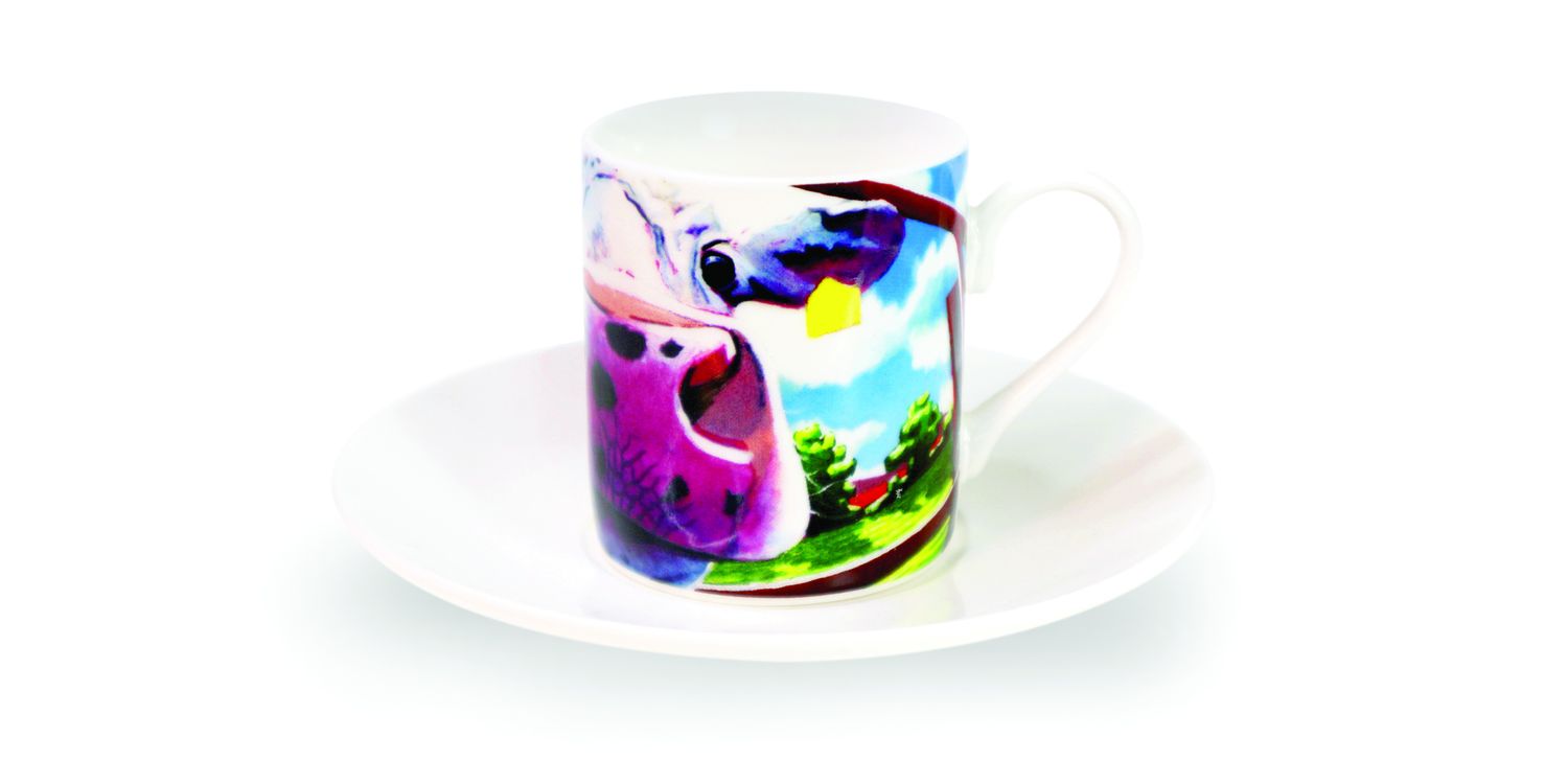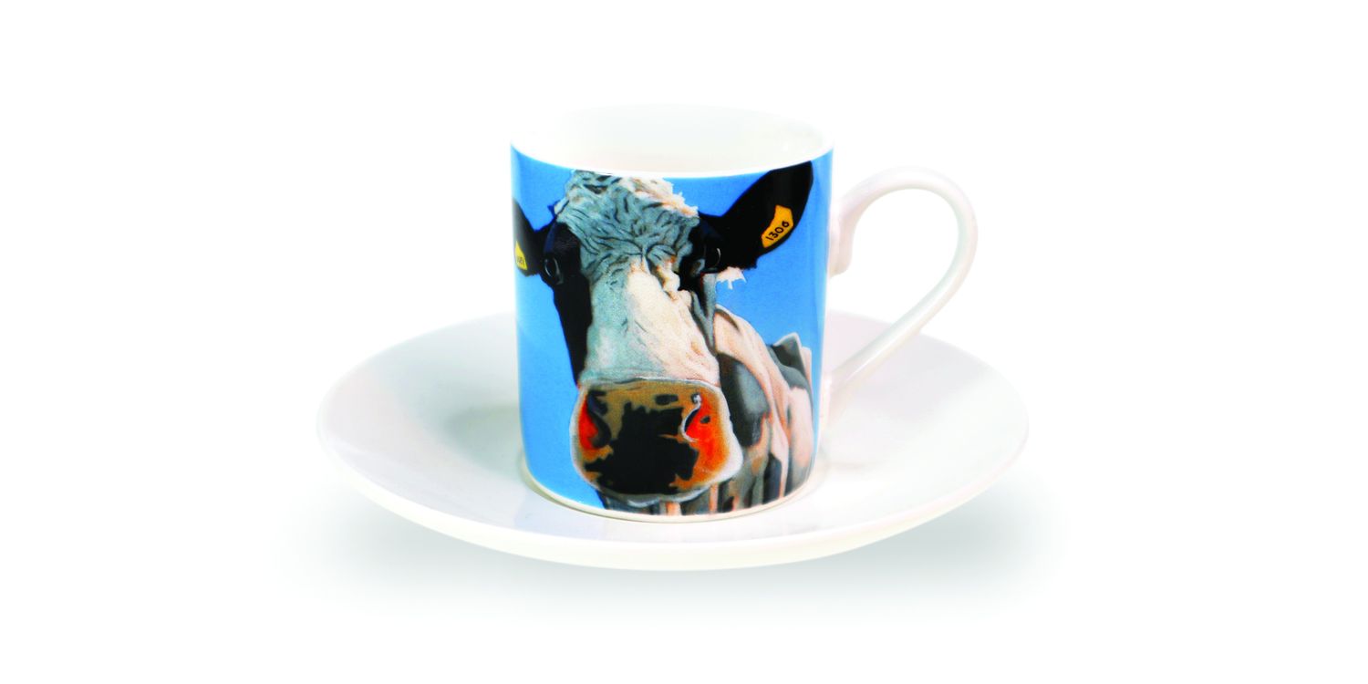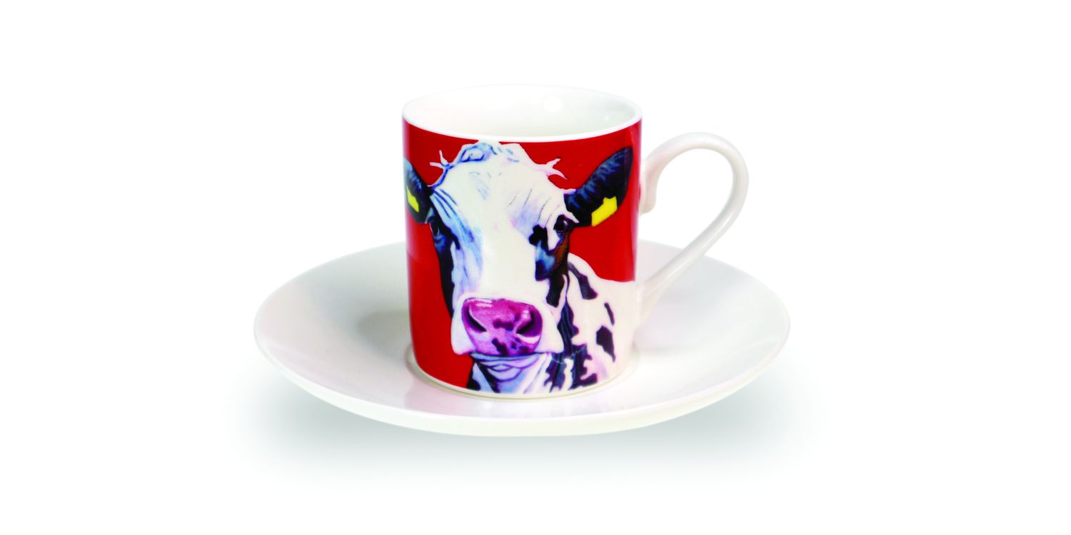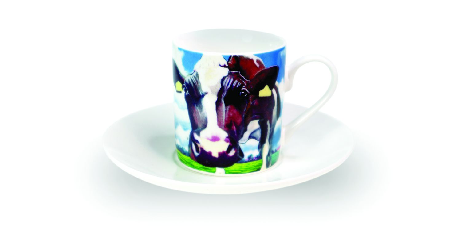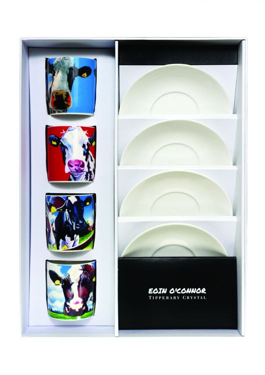 Set of Four Eoin O'Connor signature Cow artworks on stylish Espresso Cups. Made from New Bone China the set of four Espresso Cups are presented in a reusable gift box.