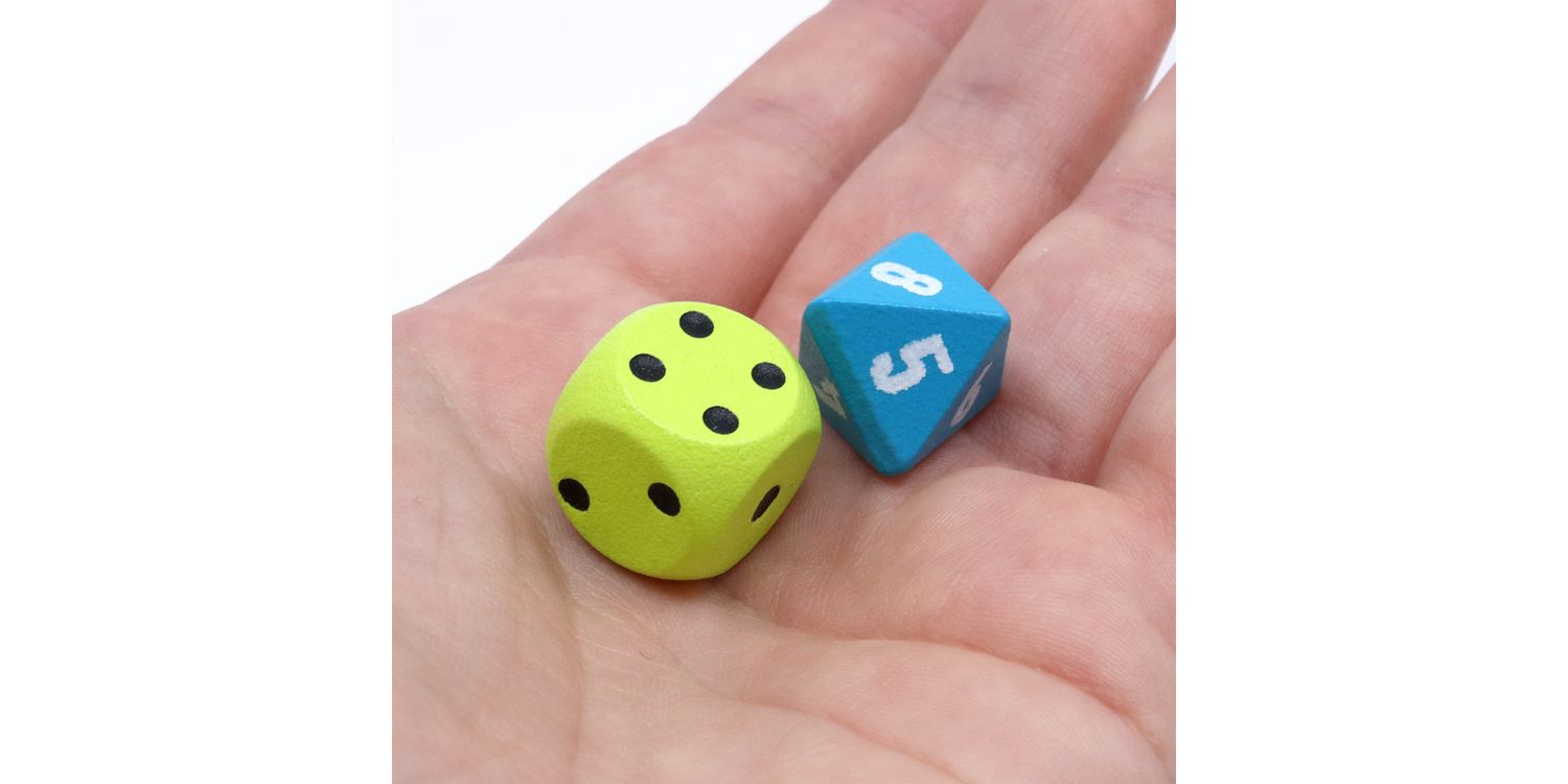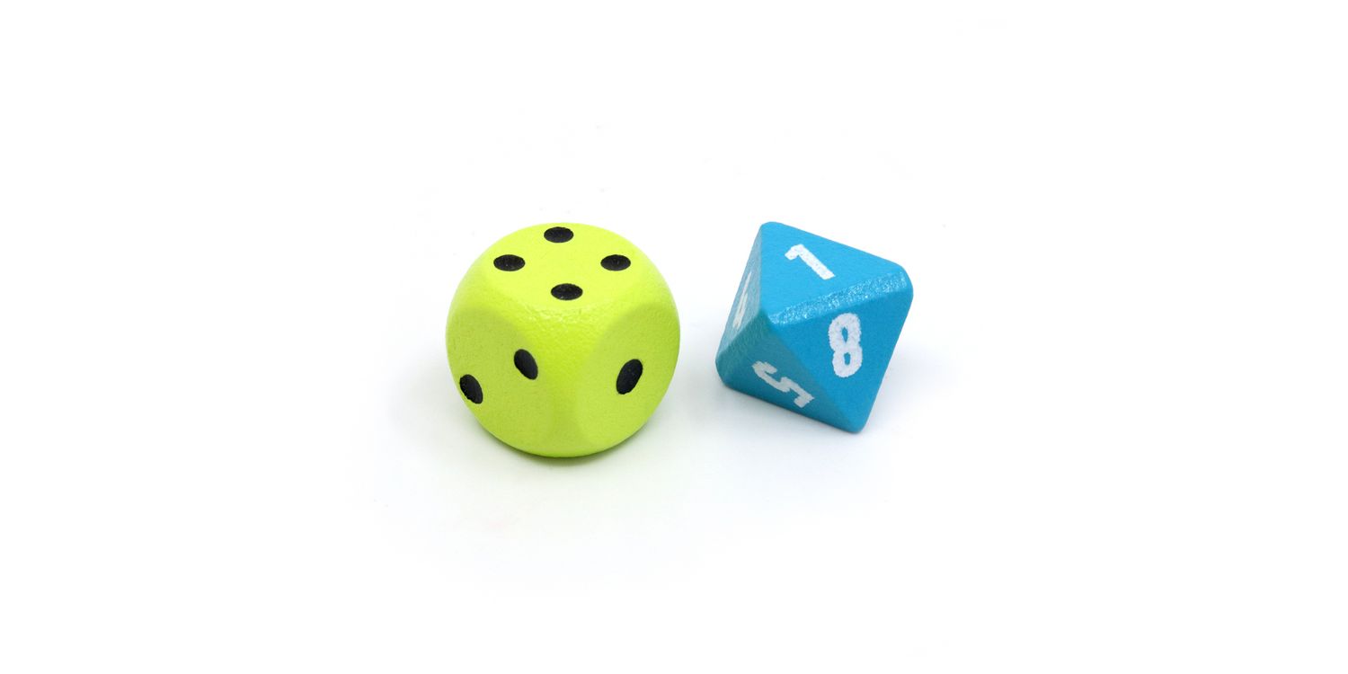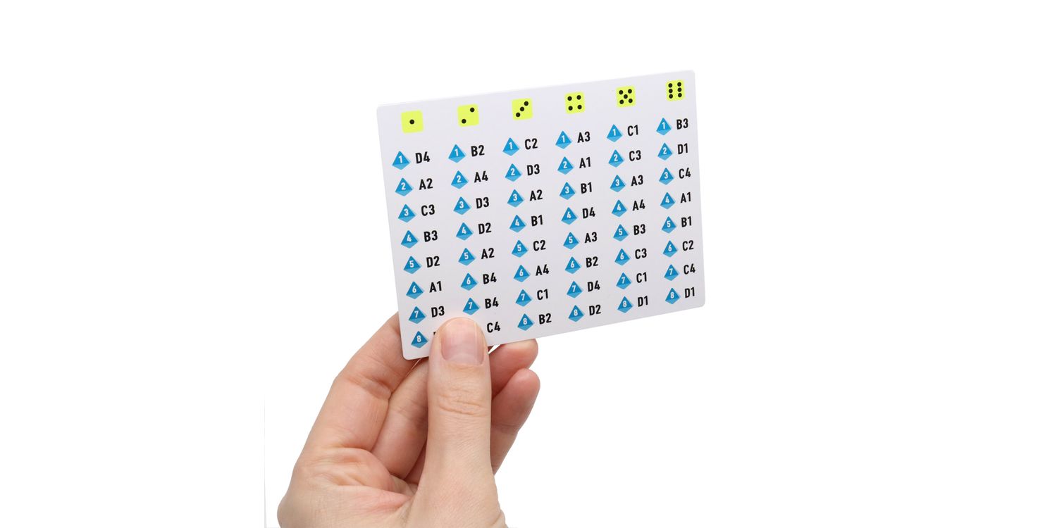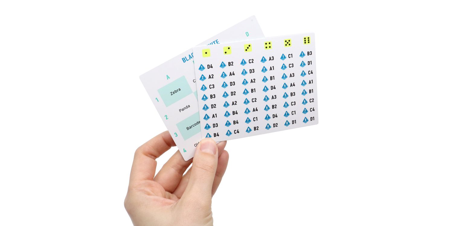 Contents: 10 topic cards (double-sided), 1 chameleon card, 7 code cards, 1 eight-sided die, 1 six-sided die