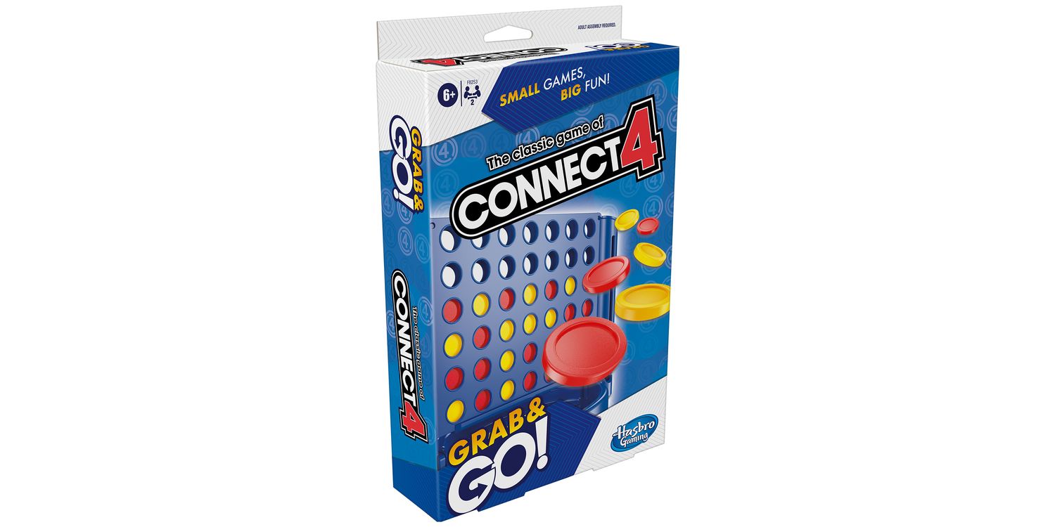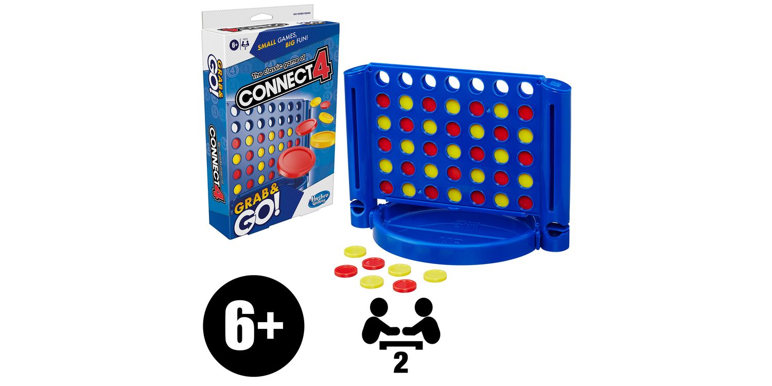 Connect 4 the win on the go with this Connect 4 Grab and Go game! It features the same classic Connect 4 gameplay in a compact size. Both players get 21 discs apiece and the chance to get 4 in a row. But both also get the opportunity to block the other's attempts to connect their own discs! When the game is done for the day, it's easy to store the discs in the columns and fold up the trays on the playing grid. Kids ages 6 and up and adults alike can have Connect 4 fun nearly anywhere when they play with this portable Connect 4 game!