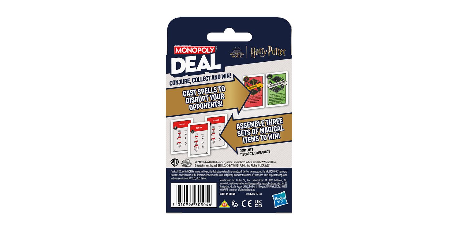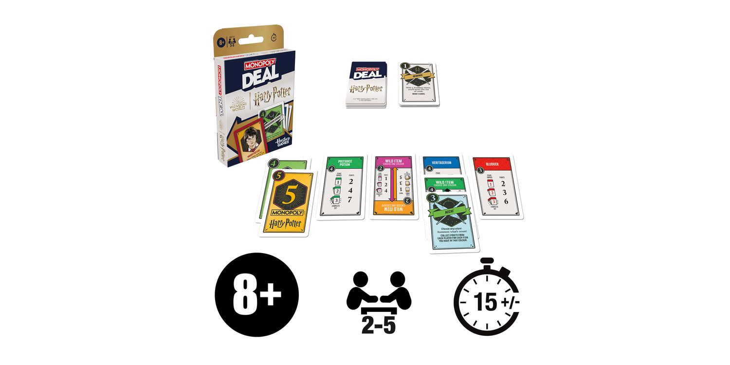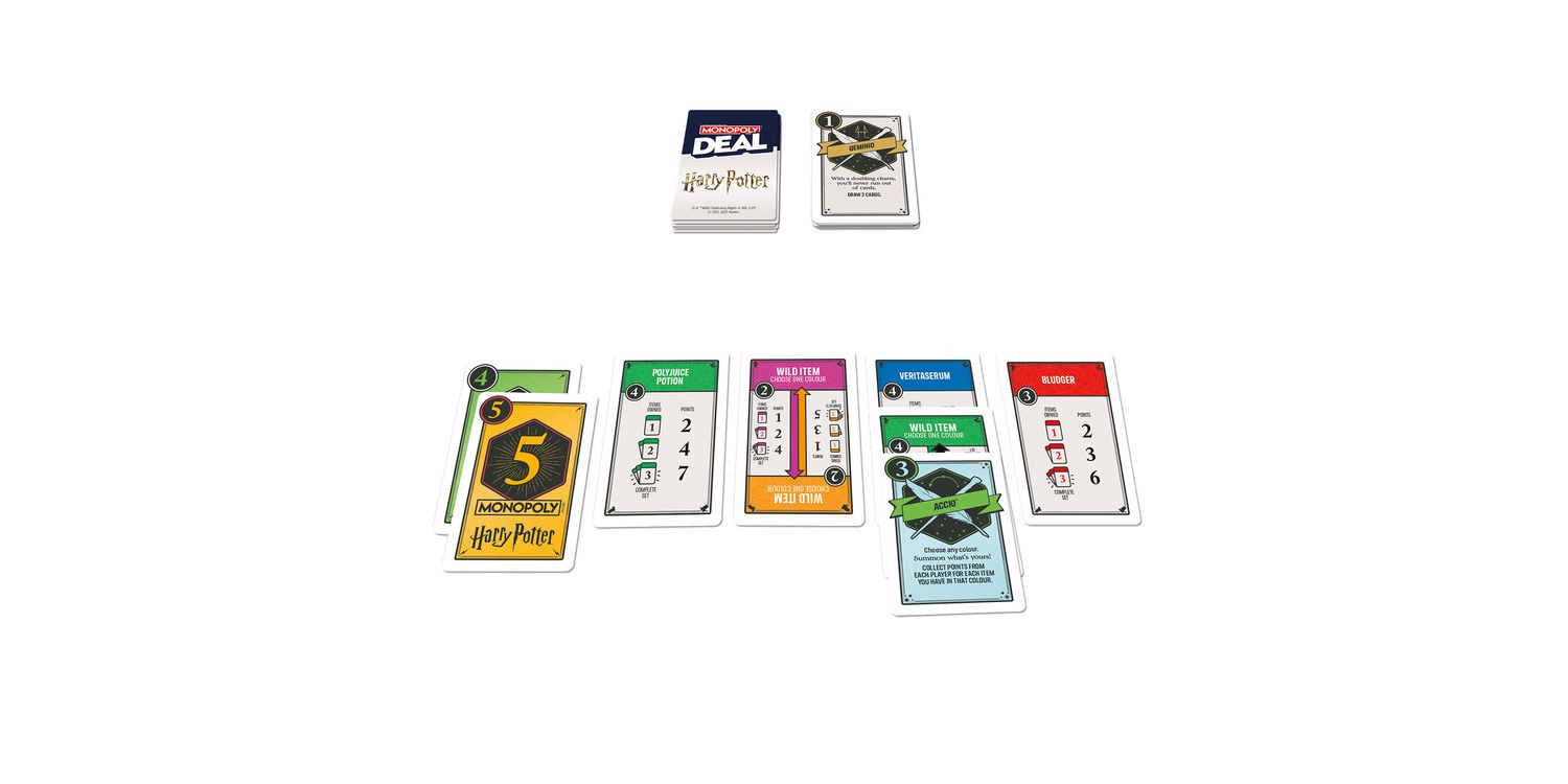 Conjure, collect, and win! In the Monopoly Deal: HARRY POTTER kids card game, a wealth of enchanted objects is waiting to be found. Be the first witch or wizard to collect 3 different sets of magical items to win. Cast spells over opponents to disrupt their plans—and receive help from iconic heroes and villains while dueling for control over the riches of the WIZARDING WORLD! This fun family card game for kids and adults can be played in about 15 minutes, so it’s an ideal game for fitting in family fun anytime. And HARRY POTTER toys and games are wonderful holiday and birthday gifts for teens, adults, and kids