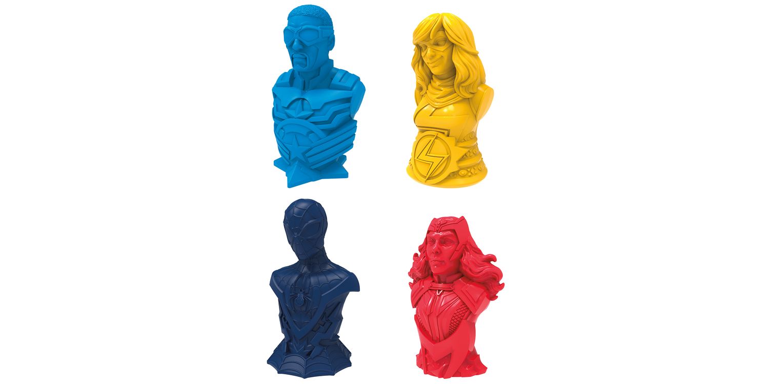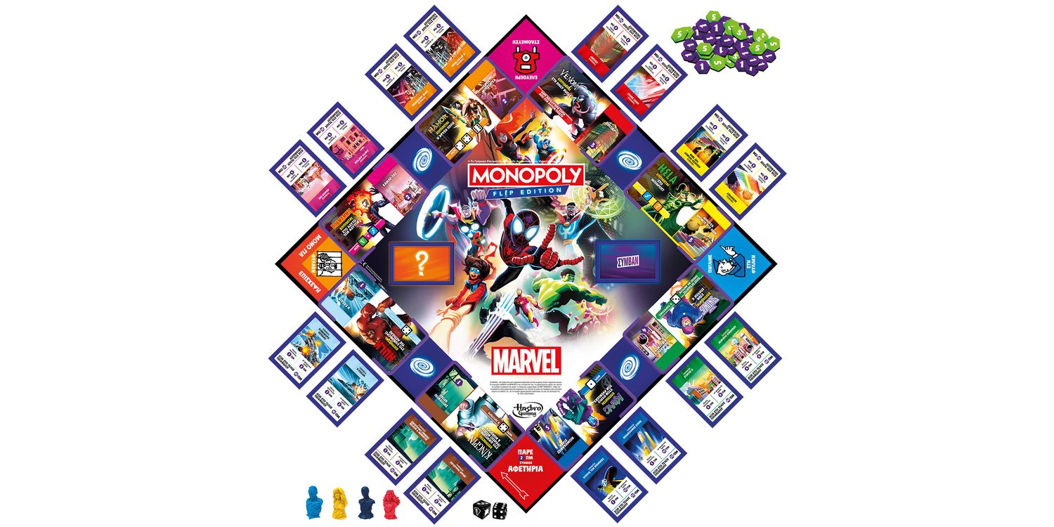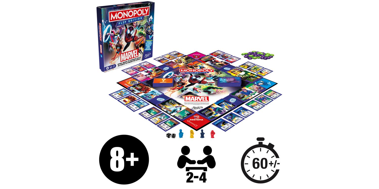 End the chaos of Kang in the Monopoly Flip Edition: Marvel board game! Time-traveling menace Kang is on the brink of conquering the Marvel Universe, and other Super Villains are capitalizing on the chaos. Playing as Captain America, Ms. Marvel, Spider-Man (Miles Morales), or Wanda Maximoff, players must team up with other Super Heroes to battle the villains, then flip gameboard tiles and race to secure the locations under attack. In this fun kids game, instead of earning money, players can earn cardboard Battle Point chips by collecting protection fees for their secured locations, teaming up with other heroes, and more. The player with the most Battle Points when all the locations have been secured wins! This strategy board game amps up the fun on Family Game Night, and it's a great gift for kids, teens, and fans of Marvel and the Monopoly board games.