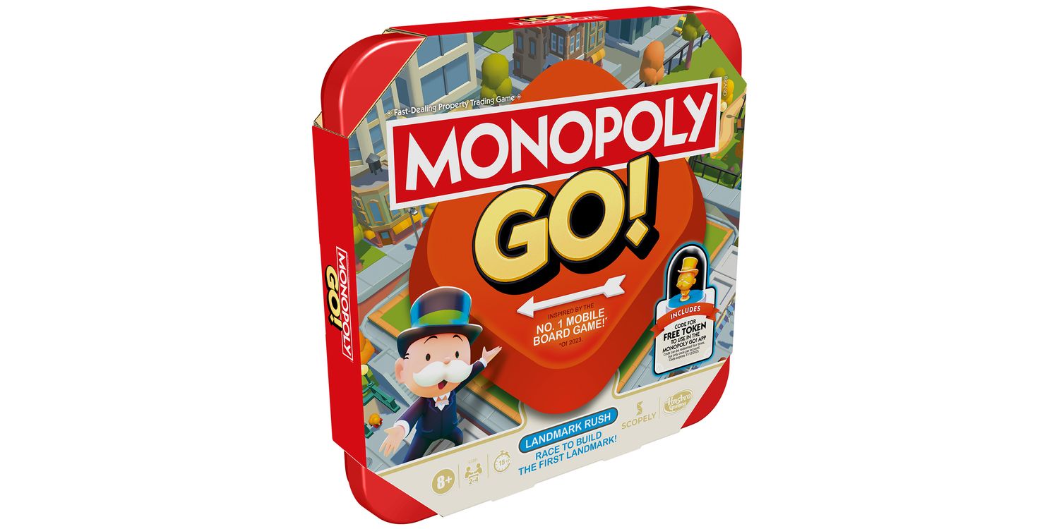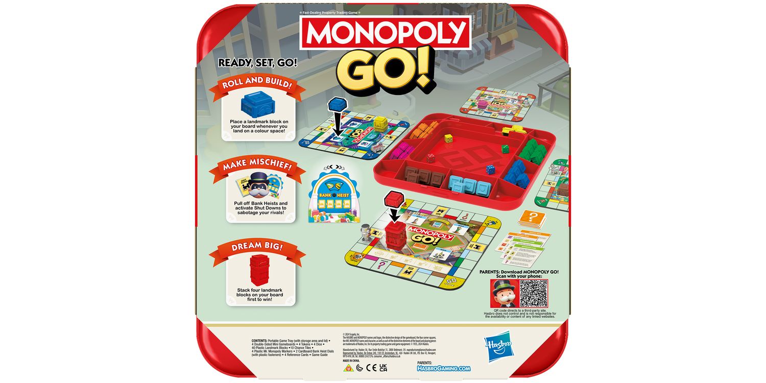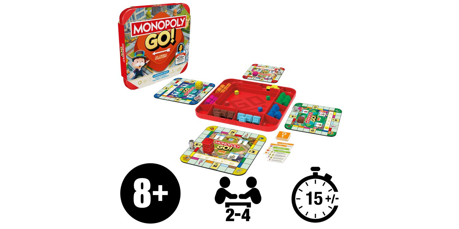 The Monopoly GO! game is all fans love about the popular mobile app game in a social table top version! In this thrilling family board game, the first player to build a landmark wins. To get started, each player chooses a mini gameboard with a favourite location, plus a matching-coloured die. Then everyone rolls their die and moves that many spaces around their board—at the same time! If a player lands on a colour space, they take a landmark block from the tray and add it to their board. Use Bank Heists, Shut Downs, and Mega Shut Downs to sabotage rivals. The first to stack 4 matching-coloured landmark blocks on their board wins! Searching for fun family games for kids, teens, and adults? This strategy game is a great choice for anytime play, and it makes a cool gift for kids ages 8+ who love Monopoly board games. The Hasbro and Monopoly names and logos, the distinctive design of the gameboard, the four corner squares, the Mr. Monopoly name and character, as well as each of the distinctive elements of the board and playing pieces are trademarks of Hasbro, Inc. for its property trading game and game equipment.