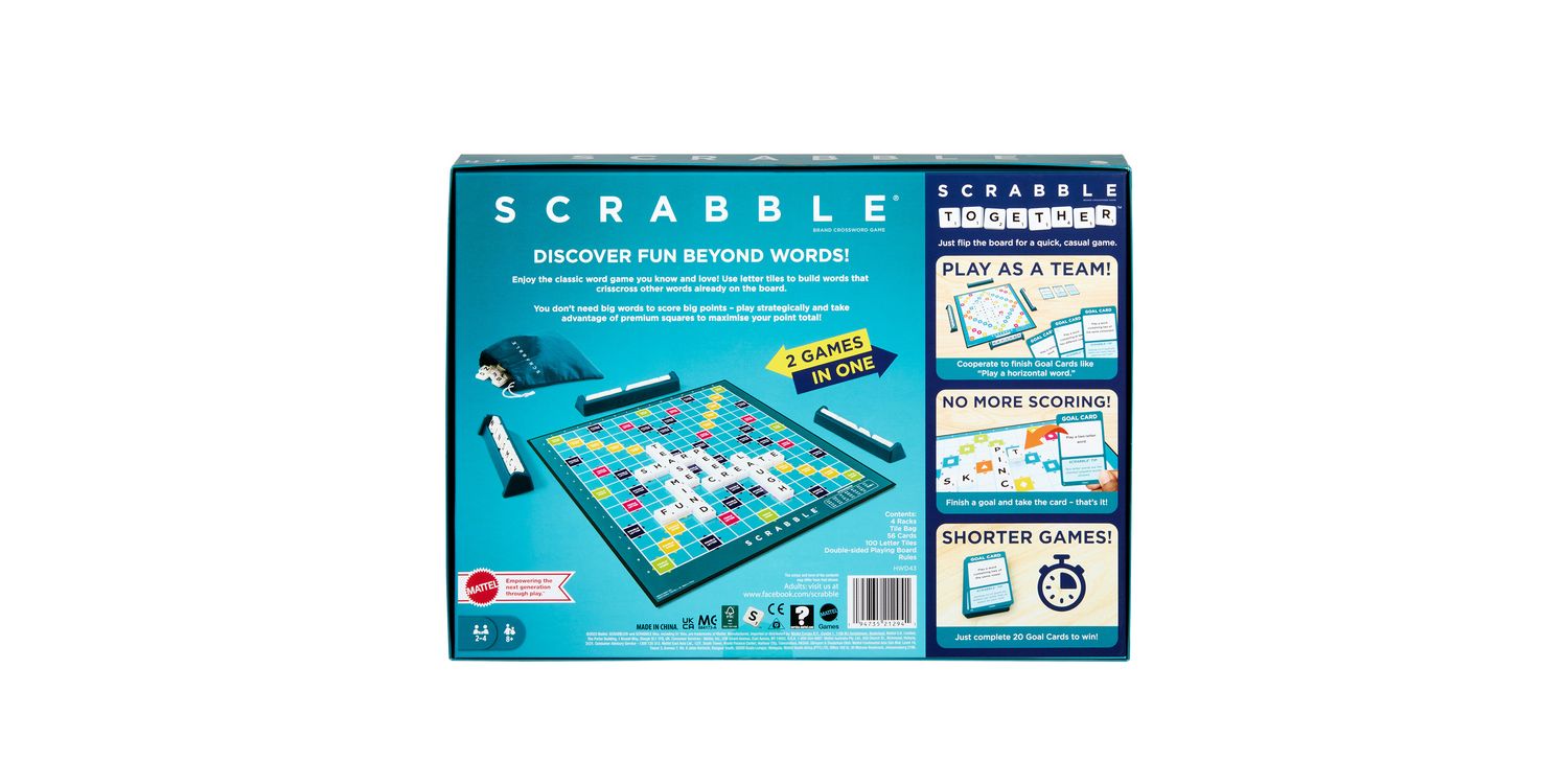 Players can enjoy the classic Scrabble® crossword game they know and love building words and angling for Double Letter and Triple Word scores or they can flip the board and try Scrabble Together™, a quick, casual game where players cooperate to complete word challenges.