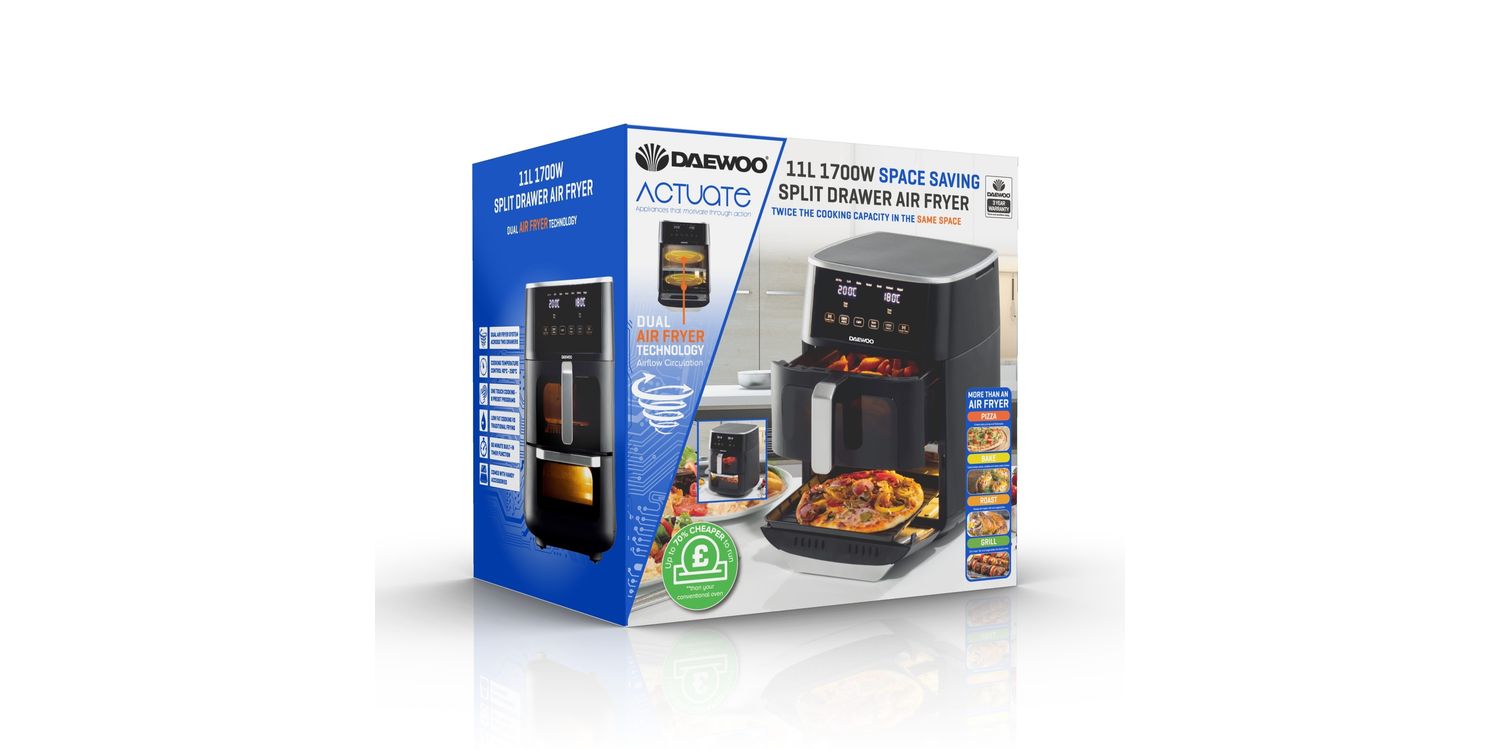Featuring a unique vertical design, this space-saving appliance offers two spacious cooking compartments - a 6-litre top drawer and a 5-litre bottom drawer - providing a combined 11-litre capacity. Its stacked layout maximises countertop space and makes it easy to cook multiple dishes at once, perfect for efficient and convenient mealtimes. Each drawer operates independently with its own timer and temperature controls, giving you the flexibility to cook different meals at different settings simultaneously.