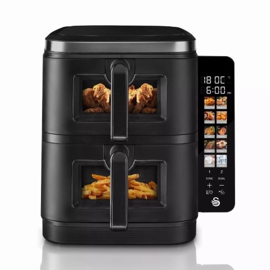 Looking to upgrade your single basket air fryer or thinking of a first time purchase but don’t have the worktop space? The Swan Duo Layer Air Fryer is what you need. Unlike standard dual basket air fryers, the baskets are stacked on top of each other, taking up 30% less worktop space. It has a large total cooking capacity of 11L, comprising two 5.5 litre baskets, each big enough to cook a whole chicken and make enough portions for a family of 8. This digital air fryer has a wealth of features, including Dual Cook that does both baskets at the same temperature and time for batch cooking or Sync for two ingredients at different settings to make the perfect meal. To make a fuss-free roast, easily quadruple your cooking capacity with the 2 included foldable cooking racks, giving you two extra layers in each basket to cook 4 different foods at once. This air fryer features energy efficient Swan Cyclone technology. With its rear fans, you get faster and even cooking across both baskets, giving you that deliciously crispy texture from frying, while saving up to 67% on energy costs compared to conventional oven cooking. The intuitive touch digital colour display lets you choose from 10 pre-set meal selections, adjust the temperature for manual frying and more with just one touch. The screen can then be neatly folded away to save you even more worktop space. Dual viewing windows let you easily check the progress of your food without stopping the air fryer mid cycle for more efficient cooking.
