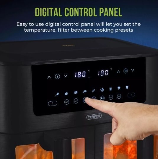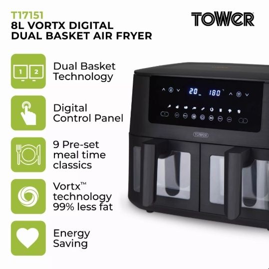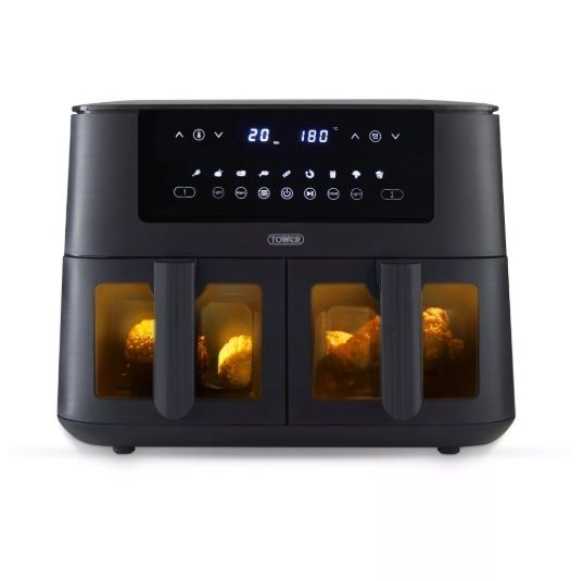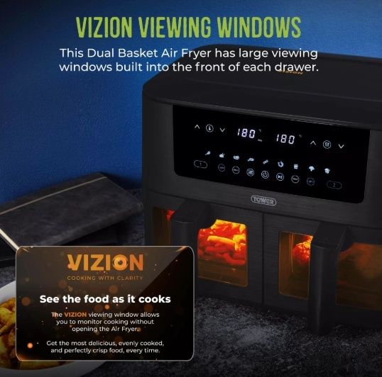 This Dual Basket Air Fryer from Tower boasts two baskets to provide the ultimate in air frying versatility, giving you the freedom to cook single portions or full family meals as required. You can cook separate meals simultaneously in the two 4L baskets with a combined capacity of 8L, enough space to feed the whole family. The match cook function expertly sets both baskets to cook at the same temperature for simple and seamless cooking. Choose from 9 one-touch presets to take the guesswork out of cooking. Air fry crispy, deliciously healthy chips without the need to deep fry. Make light work of cooking delicious crispy chicken or grill juicy steaks like a pro with the crisper grill plate. Become a star baker with the useful bake function, perfect for creating cakes, tarts or pies. The Vizion viewing windows built into the front of each drawer allow you to keep a constant eye on cooking progress without having to open either compartment again.