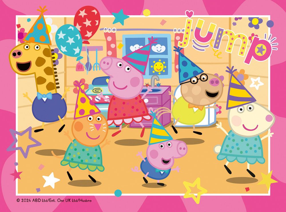 Join Peppa Pig, George Pig, Suzy Sheep, Rebecca Rabbit, Candy Cat, Emily Elephant, Pedro Pony, Danny Dog and Gerald Giraffe in these 12, 16, 20 and 24 piece jigsaw puzzles as each puzzle explores different themes, 'Smile', 'Party', 'Jump' and 'Let's make music' - all themes linked to party and celebration!
