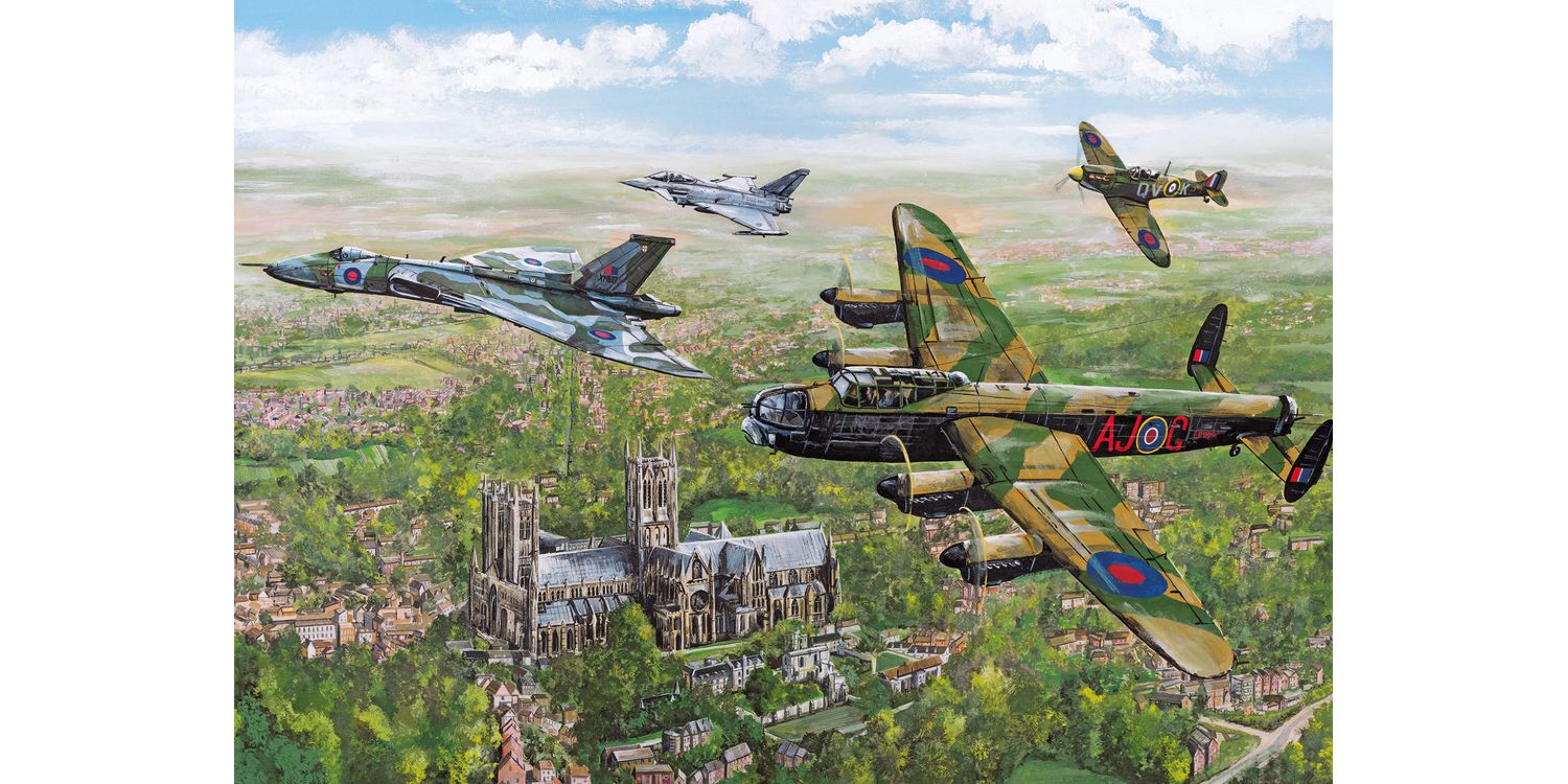 Flying gracefully over Lincoln Cathedral, these four aircraft highlight the importance of past and present UK air defence. In this puzzle by Matthew Emeny, the Lancaster and Spitfire are shown breaking away from the formation, to symbolise old heroes moving aside to make way for the Vulcan and a modern-day fighter, the Typhoon, as the RAF continue their story.