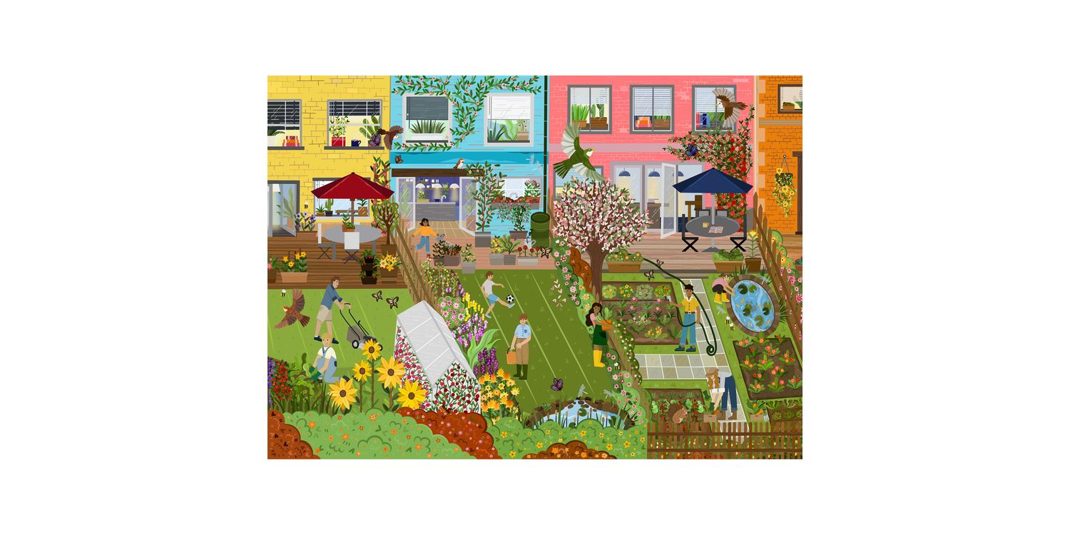Spring has finally sprung in this vibrant illustration by Bethany Lord. From striking sunflowers to budding vegetable patches, the design certainly bursting with life. The local residents are making the most of the sunshine and are tending to their gardens. Whether that be mowing the grass, watering the pots or making sure the cheeky squirrels don’t eat the latest crop!