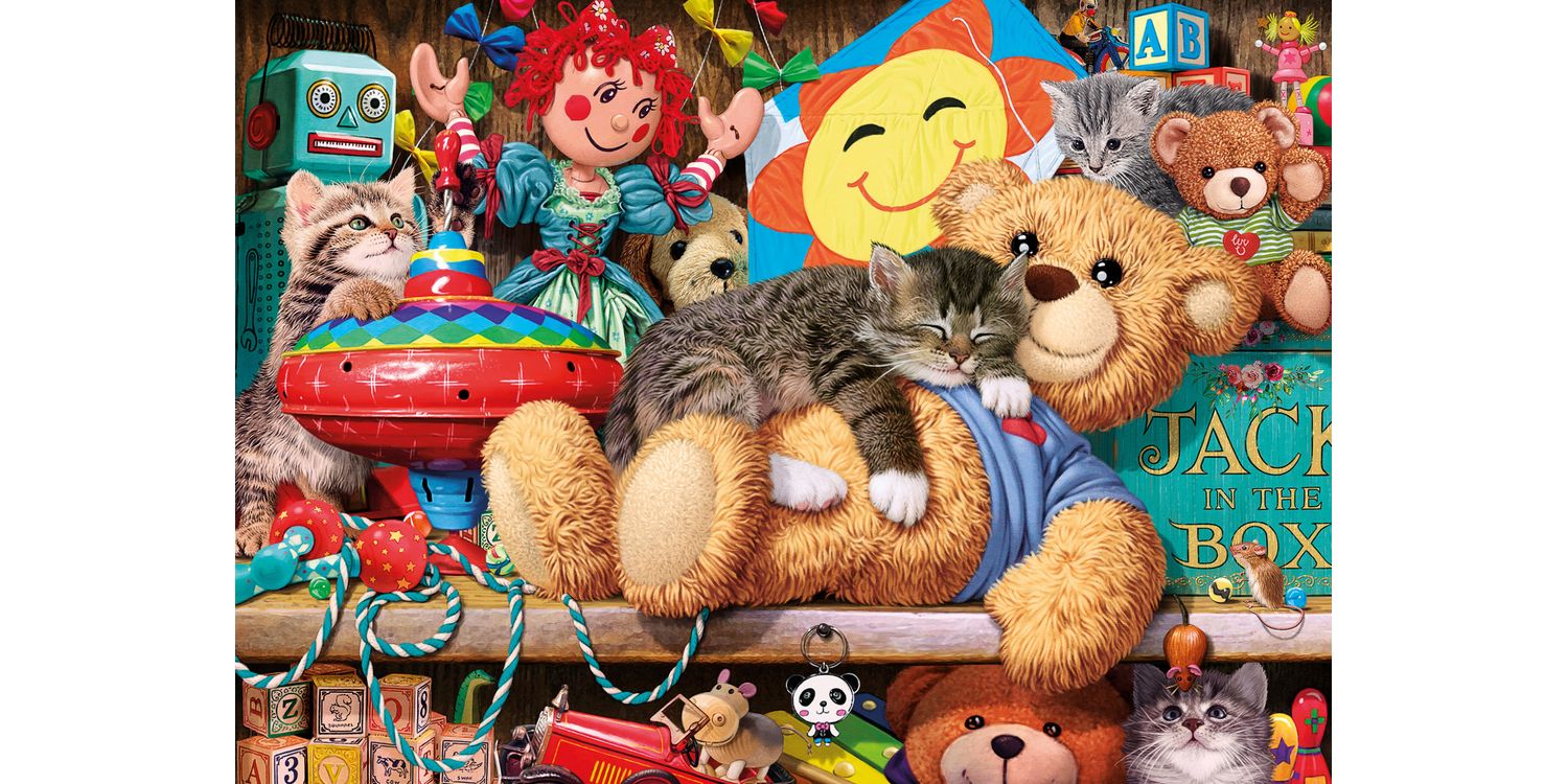 Four little kittens found their way into the toy cabinet. There is so much in here to capture their interest, including a dolly, a robot, enticing kite strings or a bright spinning top. And which mouse to choose from- a still wooden one or a lively real one? But the biggest attraction of all is a big soft-bellied Ted, which is oh-so-comfy for snoozing on!