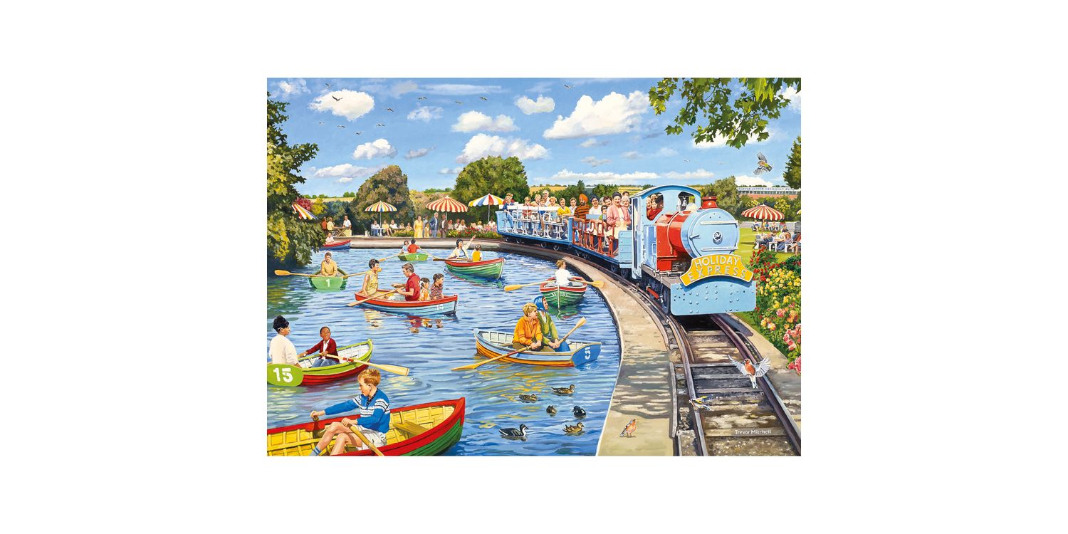 Holidaymakers are enjoying the beautiful summer’s day out on the lake. The Holiday Express seems to have captured the attention of the younger rowers as well as the little feather friends as it goes by. This nostalgic 1000 piece puzzle is beautifully painted by Trevor Mitchel and makes up one half of our 4 x 500 multi-box ‘Wish you Were Here’.