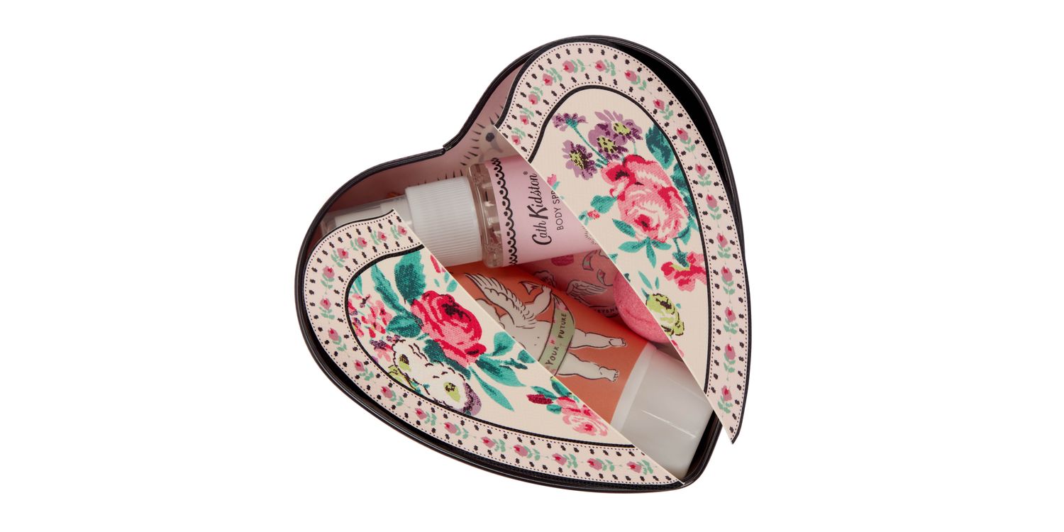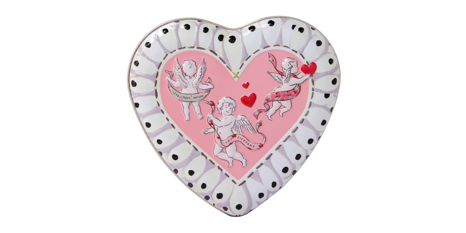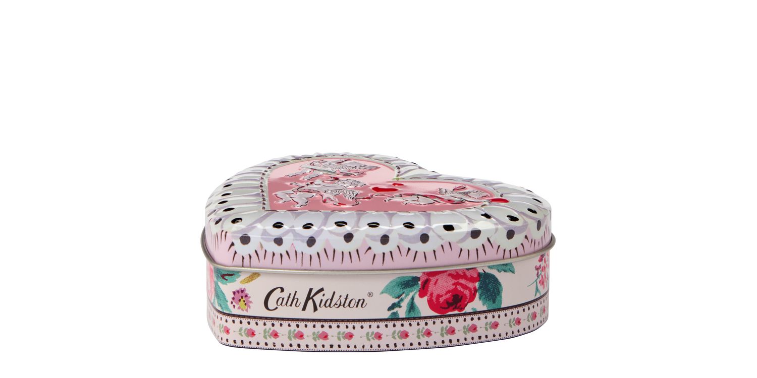 Discover the artistry of our hand painted prints where frilly collars meet vintage stripes and bold archive florals. Cath Kidston details include a heart shaped insert with roses and cherubs inside the tin. The heart opens to reveal the treats inside.