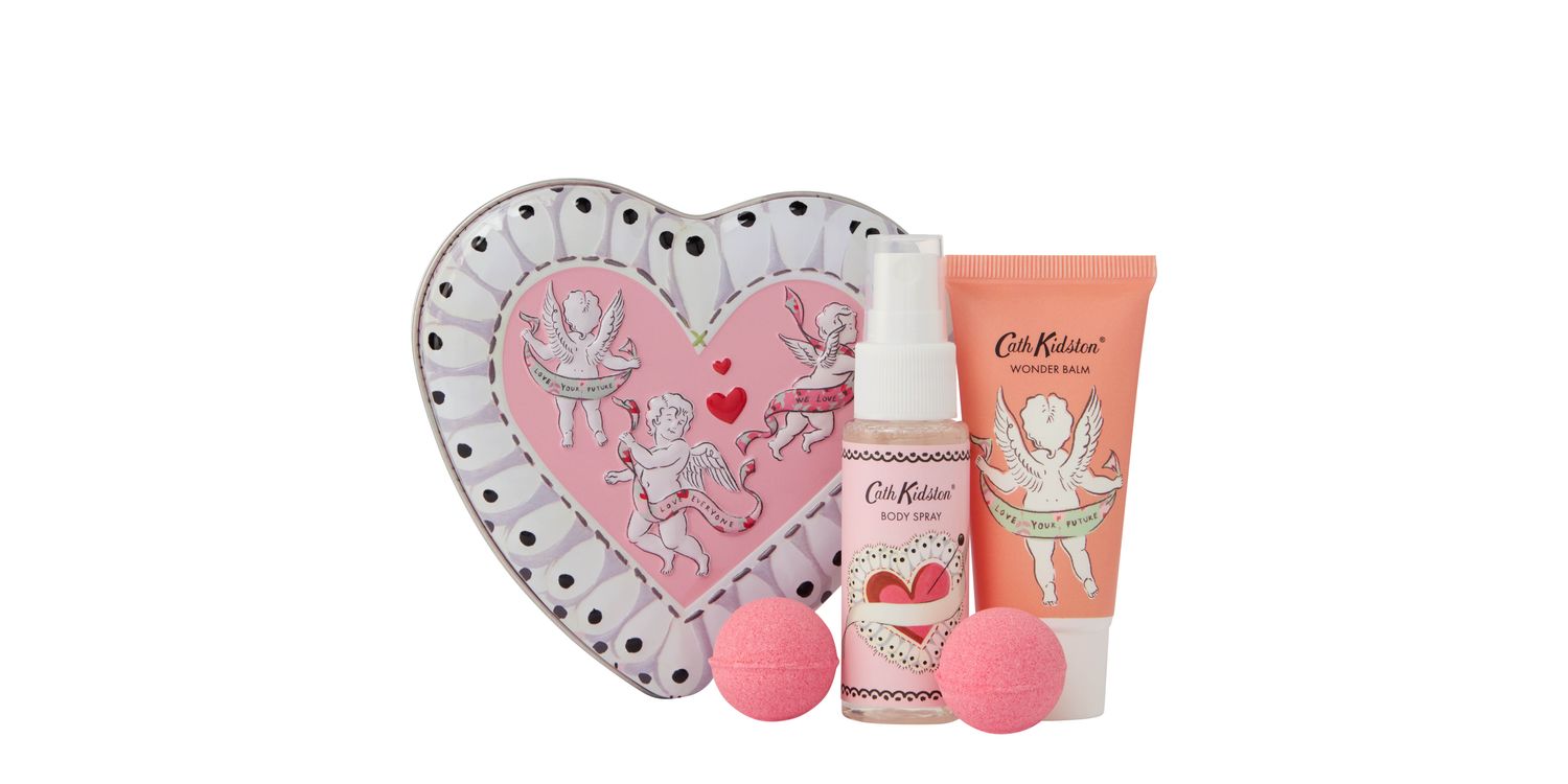 An irresistible heart shaped tin embossed with hearts, cherubs and words of love, filled with uplifting scented bath and body treats with essential oils. A perfect beauty gift for her.