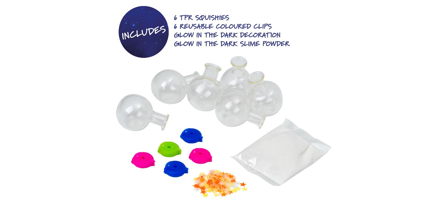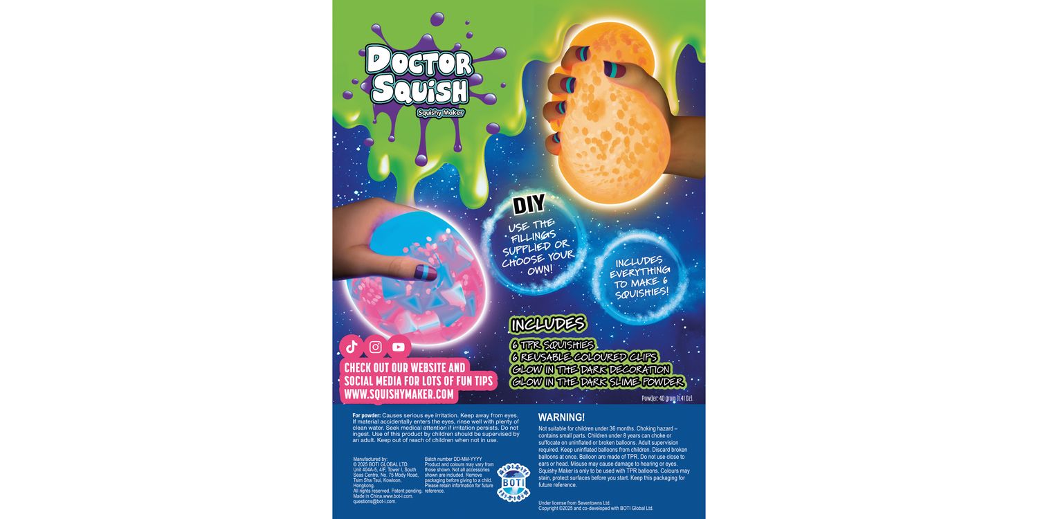 MAKE YOUR OWN SQUISHIES: The Squishy Refill pack contains more fun deco and extra TPR squishies to use with the official Doctor Squish Squishy Maker! JOIN THE SQUISHY SQUAD: Create your own fun squishies using the the Doctor Squish Squishy Maker. Will you be the next Doctor Squish? ENDLESS CREATIVE POSSIBILITIES: Use what comes with the set or choose your own fillings, using your own slime and sensory toys to make the ultimate squishies CREATE YOUR SUPER SLIME: Just add water to make your own slime, to use as your squishy filling WHAT’S IN THE BOX? Includes Glow in the Dark Slime Powder, 6 x TPR balloons, Glow in the Dark Sparkles and 6 clips.