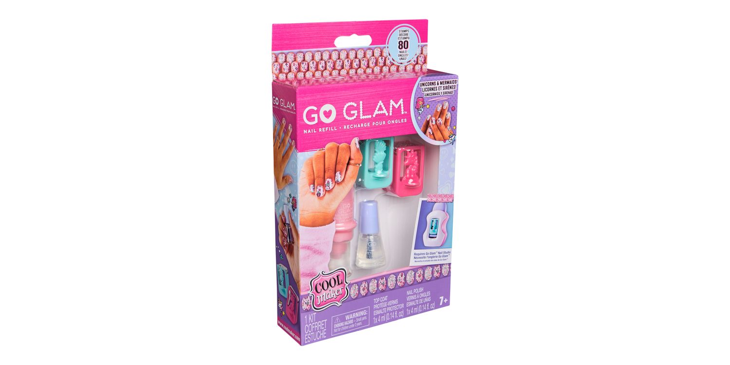 Stamp more stylish manicures with the Cool Maker GO GLAM Nail Refill. This nail design kit will inspire creativity and build confidence as girls express their style, designing their own unicorn and mermaid-themed manicures using the kit with the GO GLAM Nail Studio (nail stamper kit sold separately). The Refill’s shimmery pink easy-paint nail polish applicator and 2 designs can be used to stamp 80 nails of any size. Pop a cartridge into the stamper and close the nail mask over a finger and adjust — its silicone cover exposes the nail to keep polish off skin. The easy-to-use nail polish applicator takes the guesswork out of coats; it dabs the right amount of colour on every nail. After approximately 4 minutes of drying time, the polish will have a tacky finish that smooths out once stamped. Insert a finger into the stamper and press to reveal a perfectly designed nail. Finish with the top coat for a glossy look. Whether you’re looking for birthday gifts for girls, an art kit, kids’ crafts or exciting kids’ activities for sleepovers, spa days, back-to-school, rainy days or any time, the Cool Maker GO GLAM Nail Refill is a welcome addition to the DIY fun.
