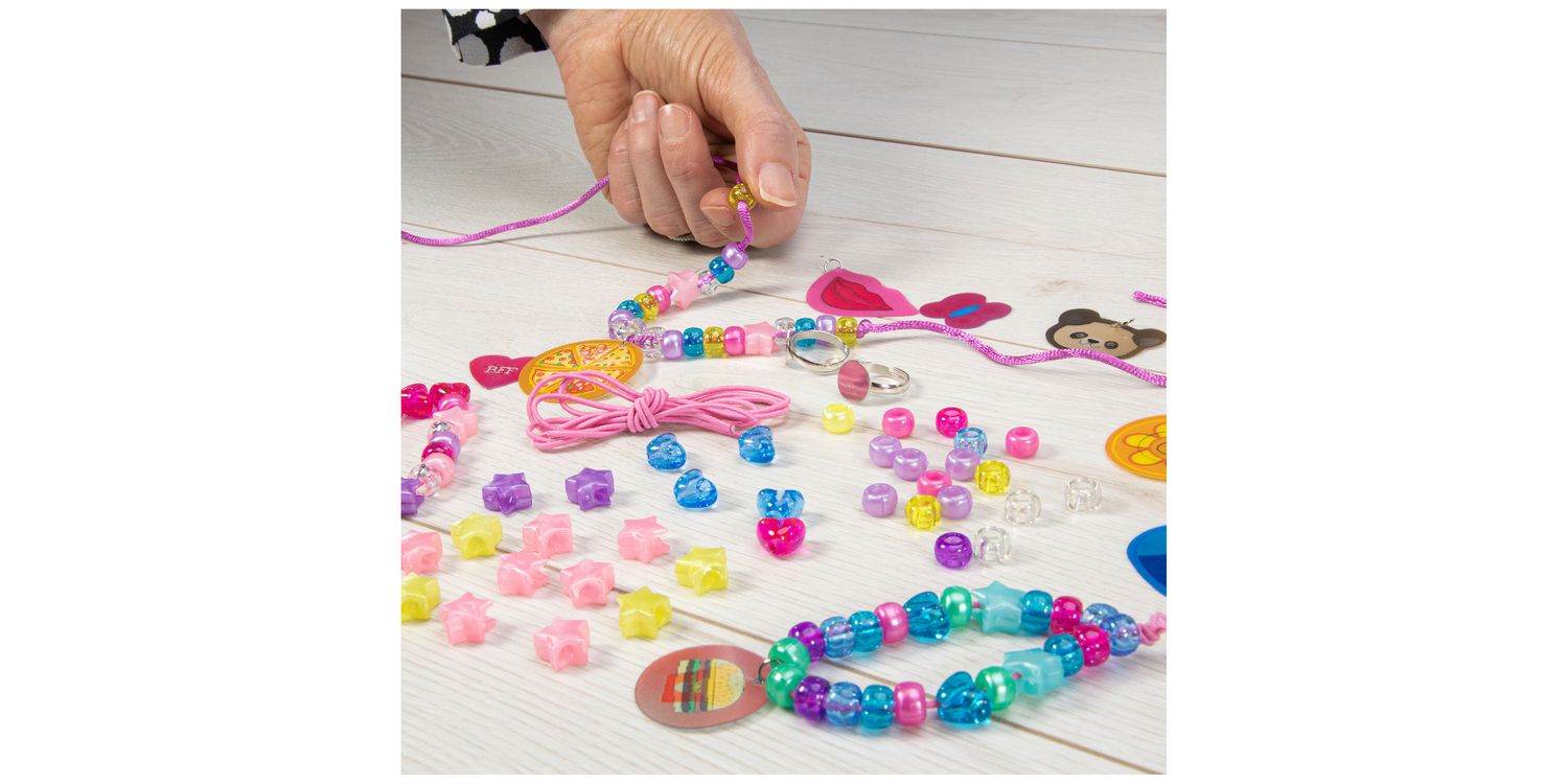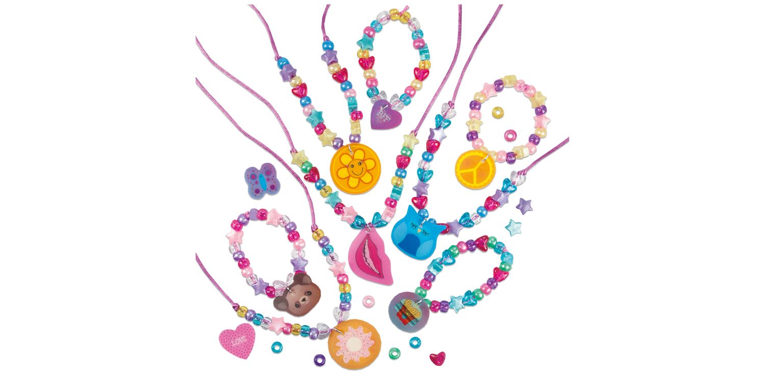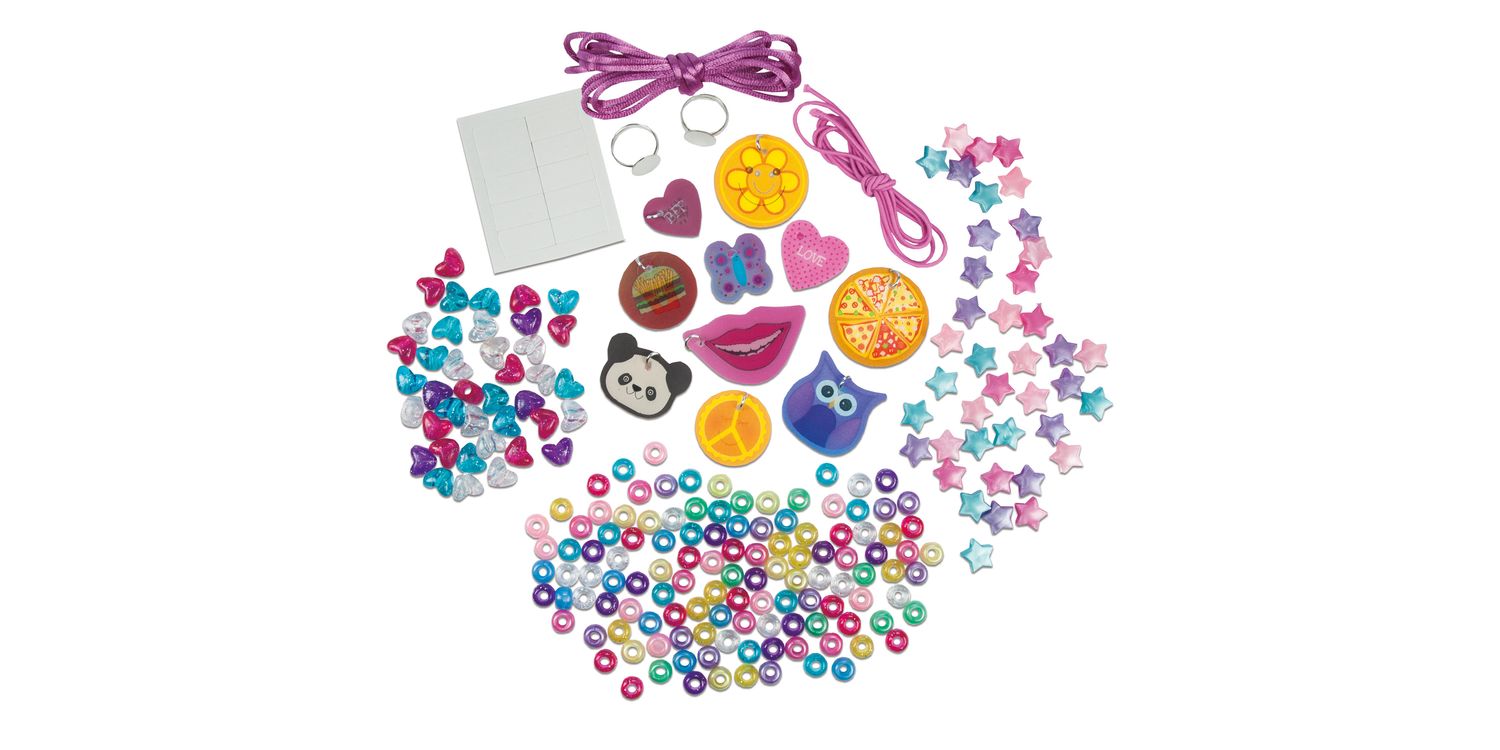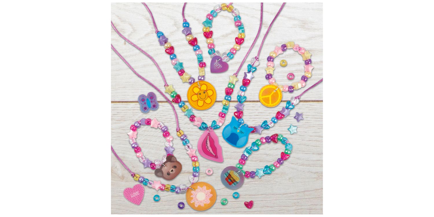 Create a selection of necklaces, bracelets and rings. Combine picture changing discs with round, heart and pony beads to make unique jewellery. This kit includes 10 picture changing discs, 120 round, 40 heart and 40 star pony beads, silky cord, elastic, 2 rings, sticky pads and guide.