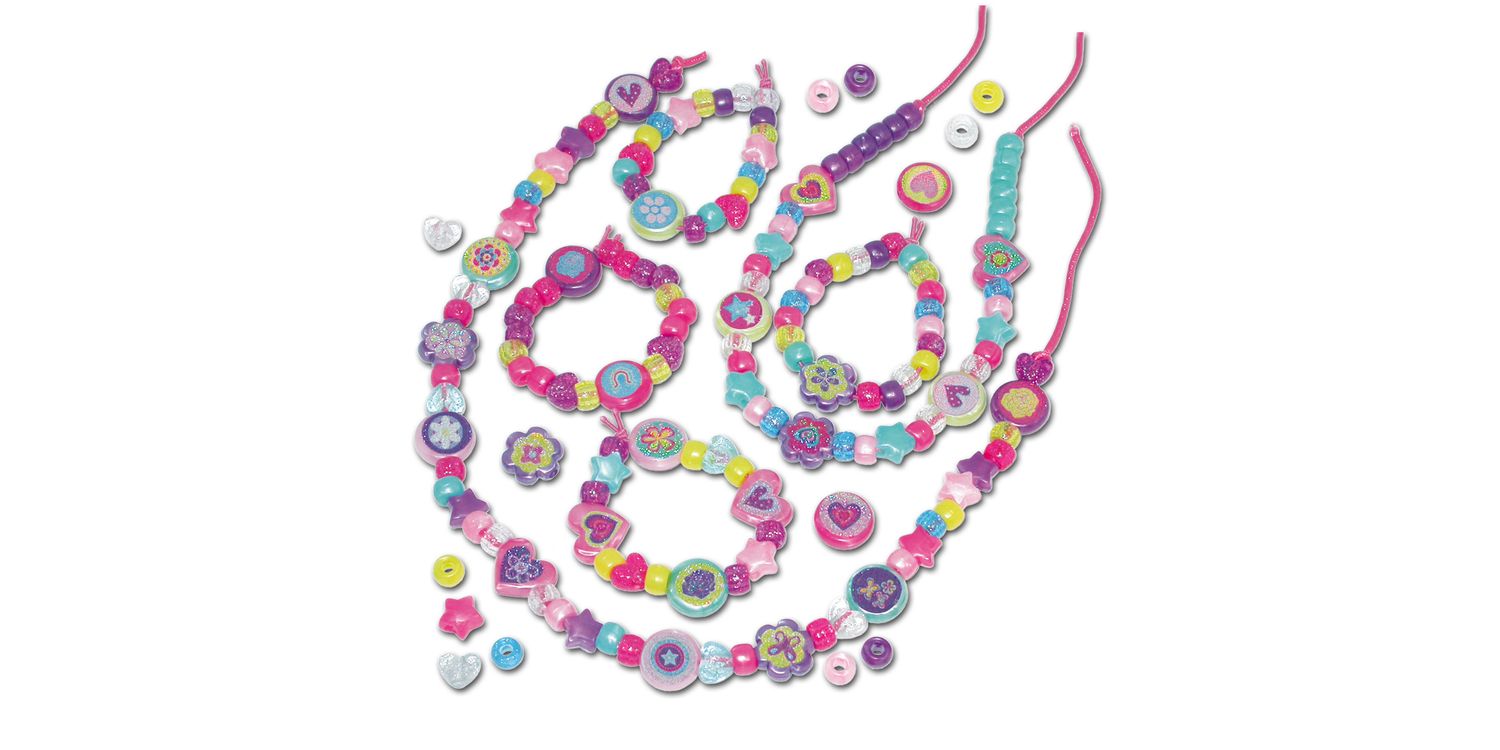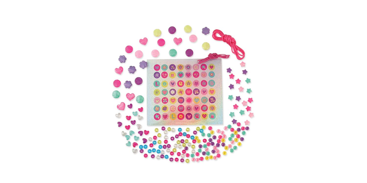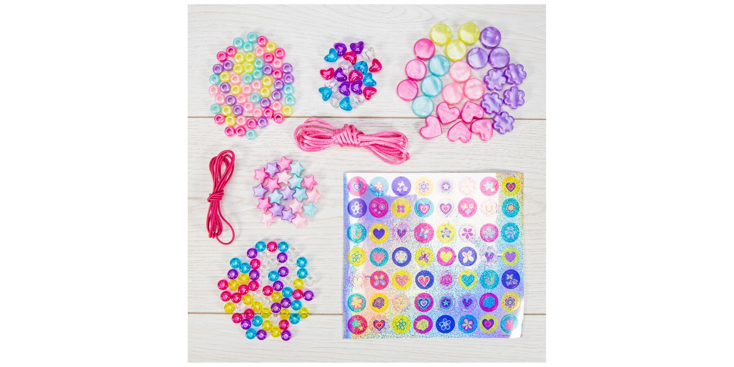 Contents: 15 round picture beads, 5 heart picture beads, 5 flower picture beads, holographic stickers, 20 heart beads, 20 star beads, 120 round beads, silky cord, elastic, guide.